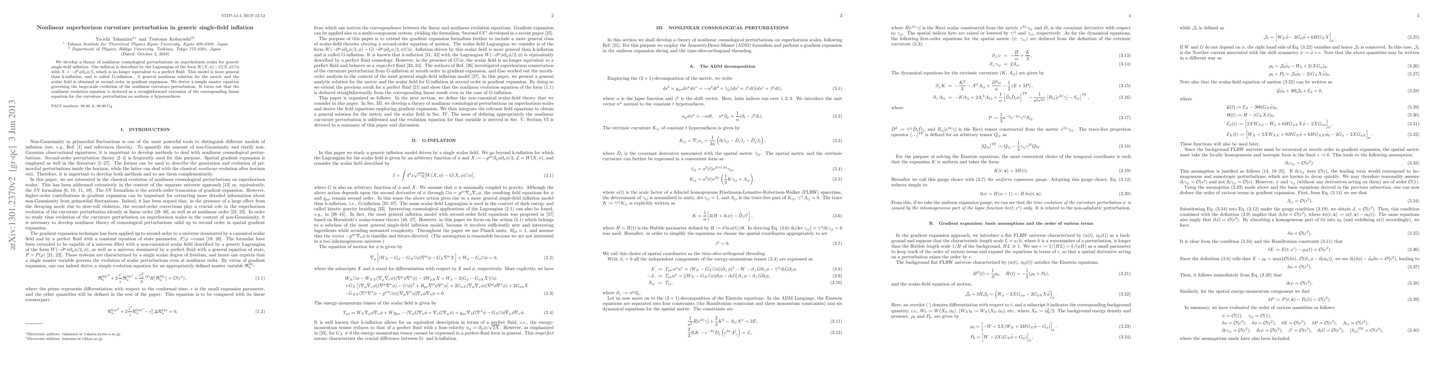 This paper develops a theory for nonlinear cosmological perturbations on superhorizon scales in generic single-field inflation, termed G-inflation, which extends beyond k-inflation. It derives a master equation governing the evolution of nonlinear curvature perturbations, extending the linear evolution framework.