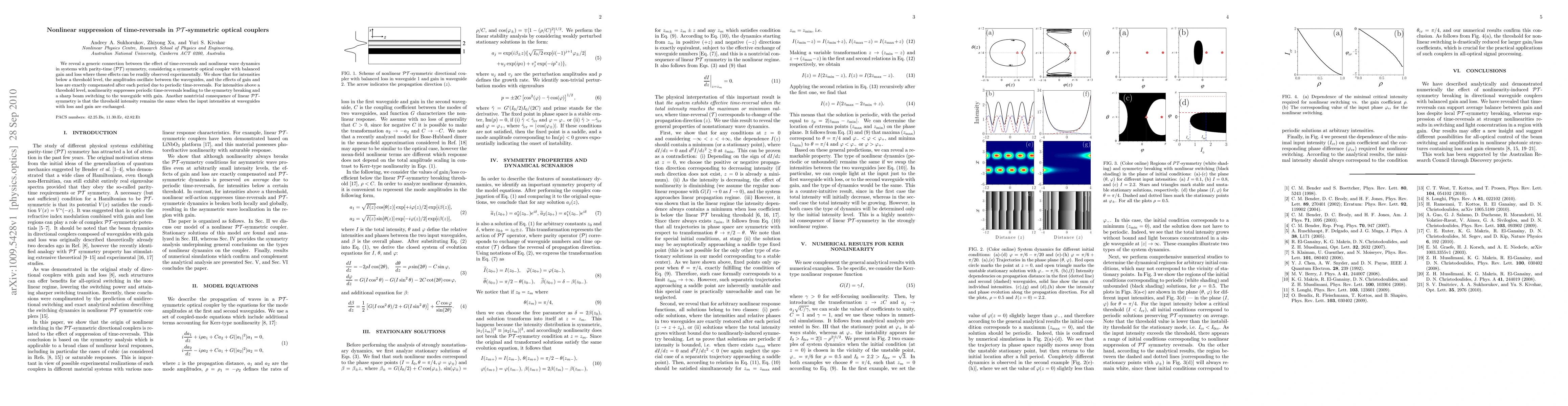 This research paper reveals how nonlinear effects suppress time-reversals in PT-symmetric optical couplers, leading to symmetry breaking and beam switching at a threshold intensity.