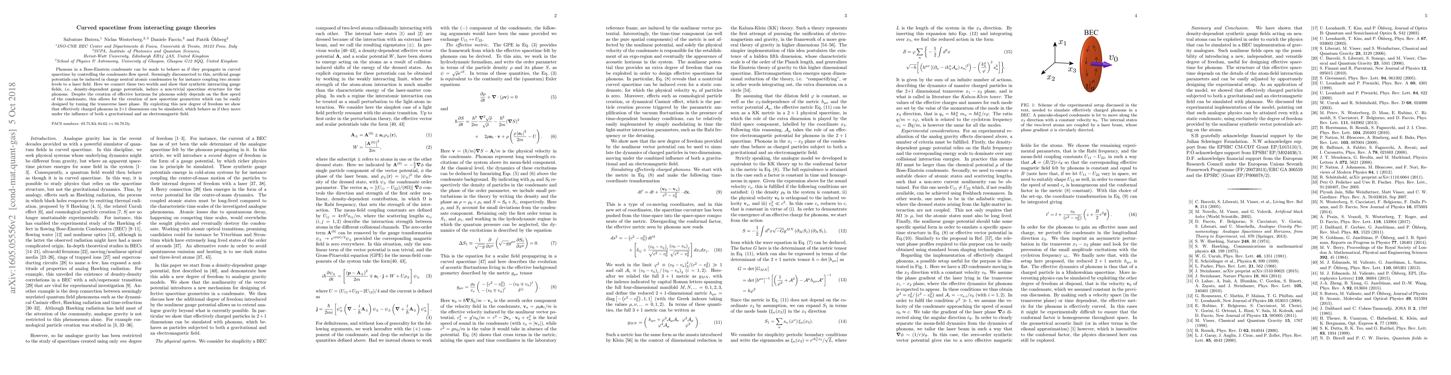 Phonons in a Bose-Einstein condensate can be made to behave as if they propagate in curved spacetime by controlling the condensate flow speed. Seemingly disconnected to this, artificial gauge potentials can be induced in charge neutral atomic condensates by for instance coupling two atomic levels to a laser field. Here we connect these two worlds and show that synthetic interacting gauge fields, i.e., density-dependent gauge potentials, induce a non-trivial spacetime structure for the phonons. This allows for the creation of new spacetime geometries which depend not on the flow speed of the condensate but on an easily controlled transverse laser phase. Using this, we show how to create artificial black holes in a stationary condensate, we simulate charge in a Reissner-Nordstr\"om black hole and induce cosmological horizons by creating de Sitter spacetimes. We then show how to combine this de Sitter spacetime with a black hole, which also opens up the possibility to study in experiments its quantum stability.