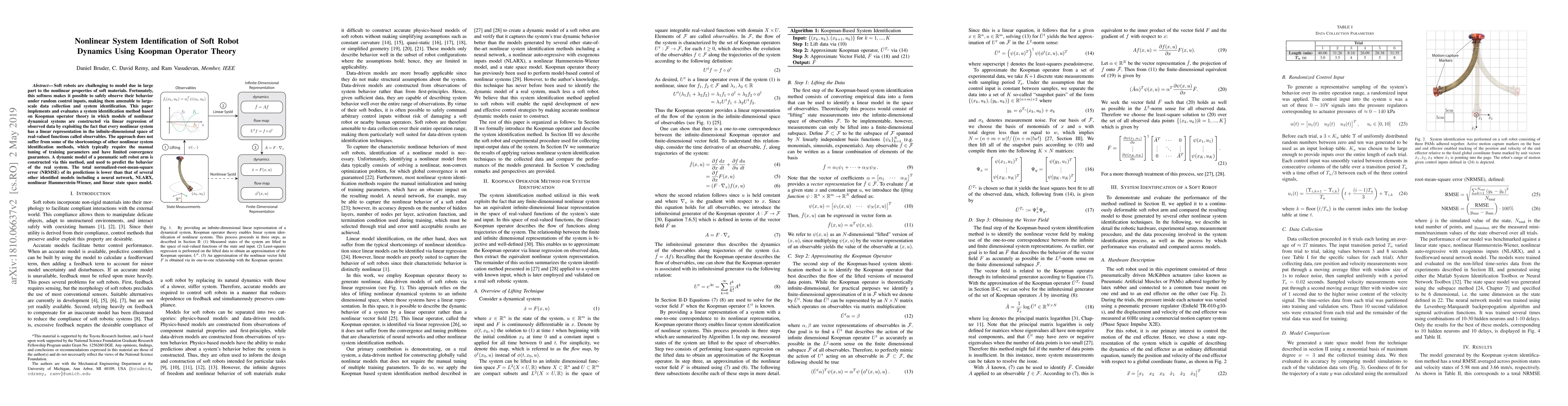 Soft robots are challenging to model due in large part to the nonlinear properties of soft materials. Fortunately, this softness makes it possible to safely observe their behavior under random control inputs, making them amenable to large-scale data collection and system identification. This paper implements and evaluates a system identification method based on Koopman operator theory in which models of nonlinear dynamical systems are constructed via linear regression of observed data by exploiting the fact that every nonlinear system has a linear representation in the infinite-dimensional space of real-valued functions called observables. The approach does not suffer from some of the shortcomings of other nonlinear system identification methods, which typically require the manual tuning of training parameters and have limited convergence guarantees. A dynamic model of a pneumatic soft robot arm is constructed via this method, and used to predict the behavior of the real system. The total normalized-root-mean-square error (NRMSE) of its predictions is lower than that of several other identified models including a neural network, NLARX, nonlinear Hammerstein-Wiener, and linear state space model.