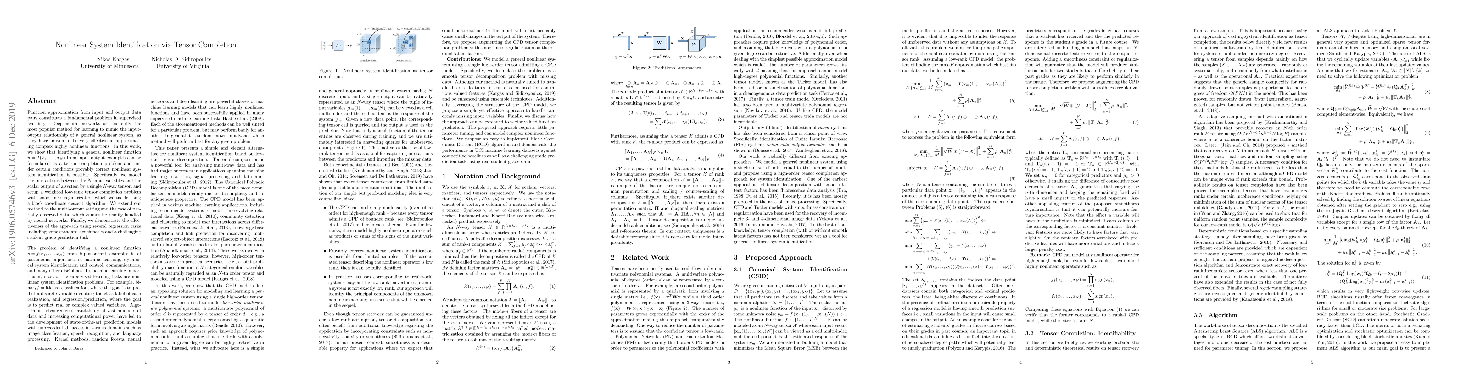 Function approximation from input and output data pairs constitutes a fundamental problem in supervised learning. Deep neural networks are currently the most popular method for learning to mimic the input-output relationship of a general nonlinear system, as they have proven to be very effective in approximating complex highly nonlinear functions. In this work, we show that identifying a general nonlinear function $y = f(x_1,\ldots,x_N)$ from input-output examples can be formulated as a tensor completion problem and under certain conditions provably correct nonlinear system identification is possible. Specifically, we model the interactions between the $N$ input variables and the scalar output of a system by a single $N$-way tensor, and setup a weighted low-rank tensor completion problem with smoothness regularization which we tackle using a block coordinate descent algorithm. We extend our method to the multi-output setting and the case of partially observed data, which cannot be readily handled by neural networks. Finally, we demonstrate the effectiveness of the approach using several regression tasks including some standard benchmarks and a challenging student grade prediction task.