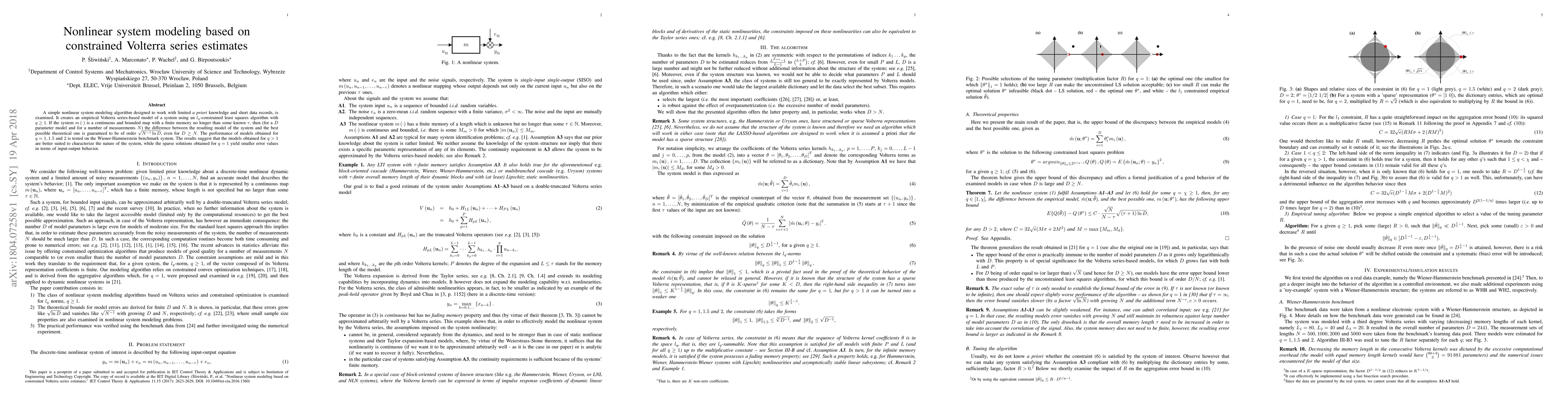 A simple nonlinear system modeling algorithm designed to work with limited \emph{a priori }knowledge and short data records, is examined. It creates an empirical Volterra series-based model of a system using an $l_{q}$-constrained least squares algorithm with $q\geq 1$. If the system $m\left( \cdot \right) $ is a continuous and bounded map with a finite memory no longer than some known $\tau$, then (for a $D$ parameter model and for a number of measurements $N$) the difference between the resulting model of the system and the best possible theoretical one is guaranteed to be of order $\sqrt{N^{-1}\ln D}$, even for $D\geq N$. The performance of models obtained for $q=1,1.5$ and $2$ is tested on the Wiener-Hammerstein benchmark system. The results suggest that the models obtained for $q>1$ are better suited to characterize the nature of the system, while the sparse solutions obtained for $q=1$ yield smaller error values in terms of input-output behavior.