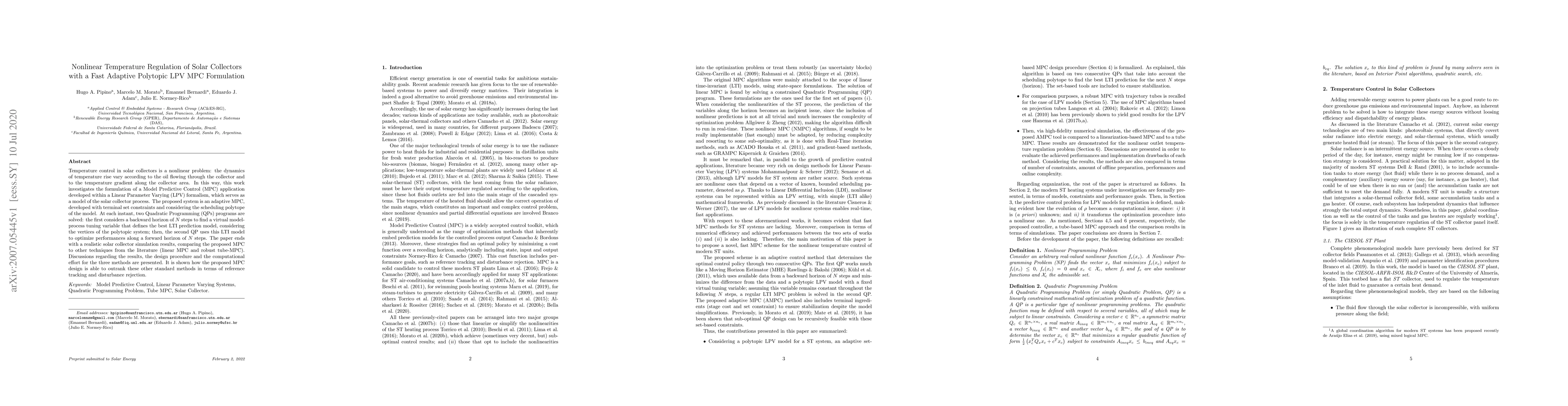 This paper proposes a nonlinear adaptive Model Predictive Control (MPC) using a Linear Parameter Varying (LPV) approach for temperature regulation in solar collectors. The adaptive MPC outperforms linear MPC and robust tube-MPC in simulations, demonstrating superior performance in reference tracking and disturbance rejection.