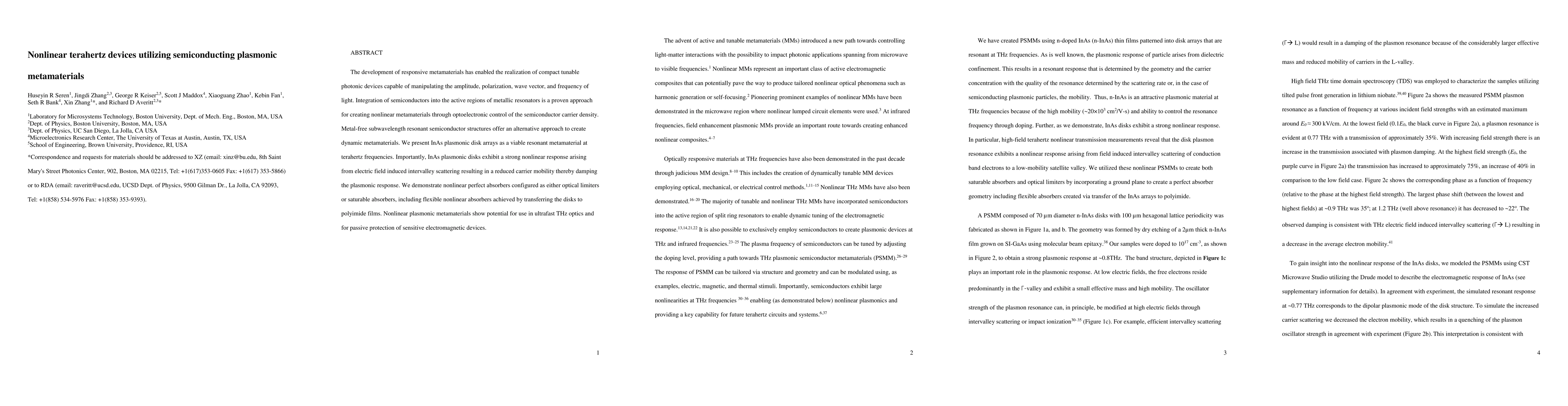 This paper explores the creation of nonlinear terahertz devices using InAs plasmonic disk arrays as dynamic metamaterials. The disks exhibit strong nonlinear responses due to electric field induced intervalley scattering, enabling their use in ultrafast THz optics and as optical limiters or saturable absorbers.
