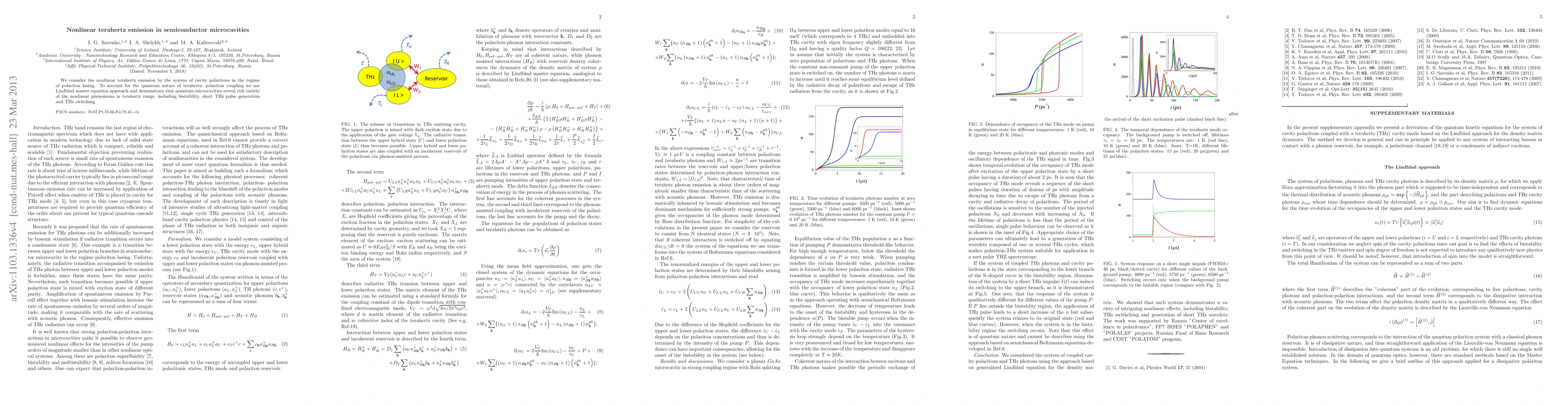 This paper investigates nonlinear terahertz emission in semiconductor microcavities through cavity polaritons in the regime of polariton lasing. Utilizing the Lindblad master equation, it reveals diverse nonlinear phenomena such as bistability, short THz pulse generation, and THz switching.