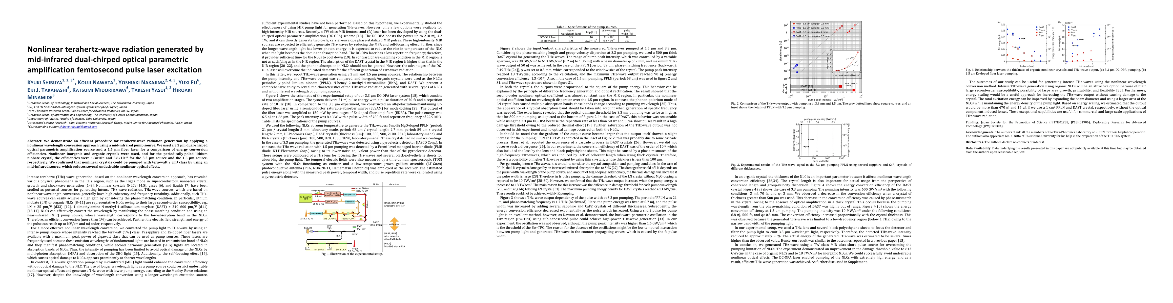 This paper demonstrates efficient terahertz-wave radiation generation via nonlinear wavelength conversion using a mid-infrared pump source, comparing efficiencies from a 3.3 μm dual-chirped optical parametric amplification source and a 1.5 μm fiber laser, achieving higher efficiency with the former.