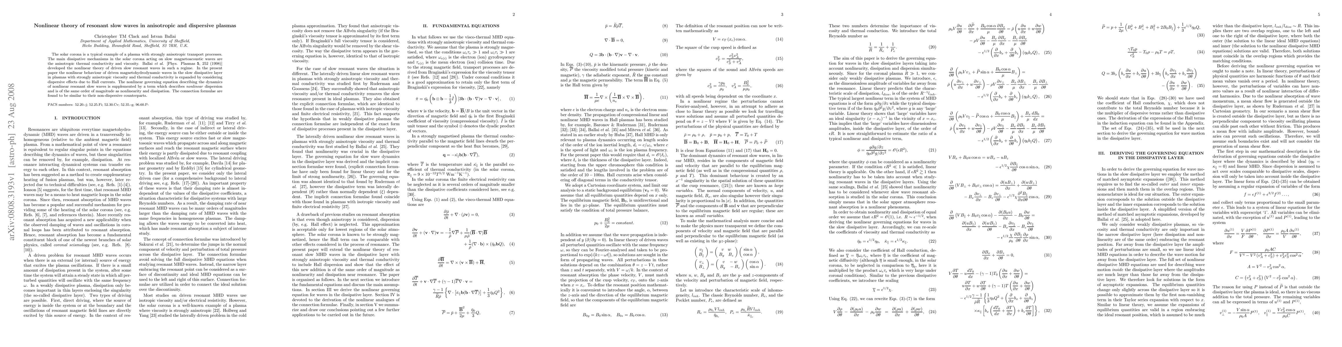 The solar corona is a typical example of a plasma with strongly anisotropic transport processes. The main dissipative mechanisms in the solar corona acting on slow magnetoacoustic waves are the anisotropic thermal conductivity and viscosity. Ballai et al. [Phys. Plasmas 5, 252 (1998)] developed the nonlinear theory of driven slow resonant waves in such a regime. In the present paper the nonlinear behaviour of driven magnetohydrodynamic waves in the slow dissipative layer in plasmas with strongly anisotropic viscosity and thermal conductivity is expanded by considering dispersive effects due to Hall currents. The nonlinear governing equation describing the dynamics of nonlinear resonant slow waves is supplemented by a term which describes nonlinear dispersion and is of the same order of magnitude as nonlinearity and dissipation. The connection formulae are found to be similar to their non-dispersive counterparts.