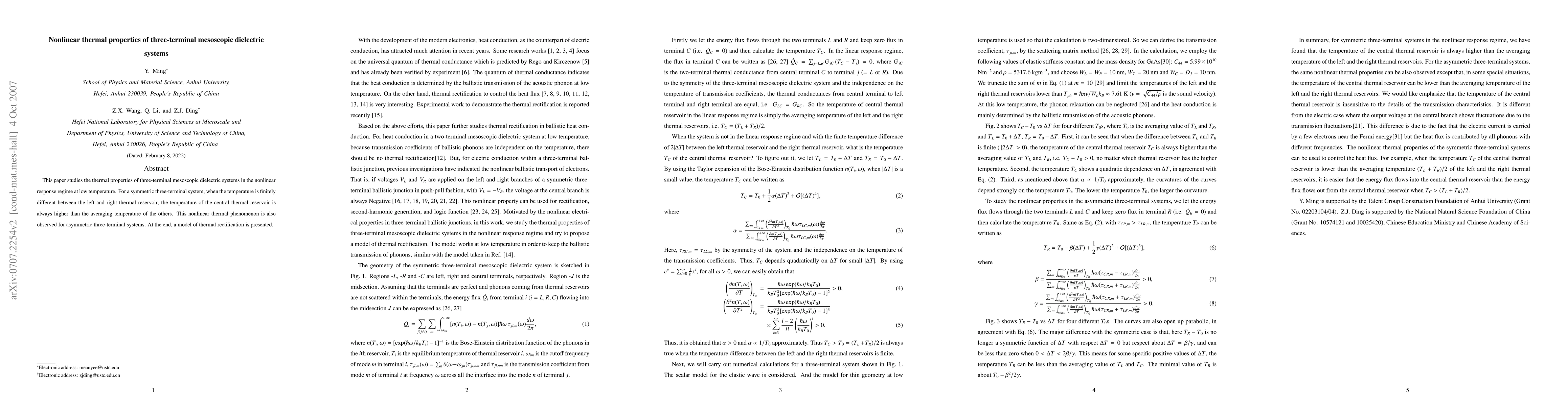 This paper studies the thermal properties of three-terminal mesoscopic dielectric systems in the nonlinear response regime at low temperature. For a symmetric three-terminal system, when the temperature is finitely different between the left and right thermal reservoirs, the temperature of the central thermal reservoir is always higher than the averaging temperature of the others. This nonlinear thermal phenomenon is also observed for asymmetric three-terminal systems. At the end, a model of thermal rectification is presented.