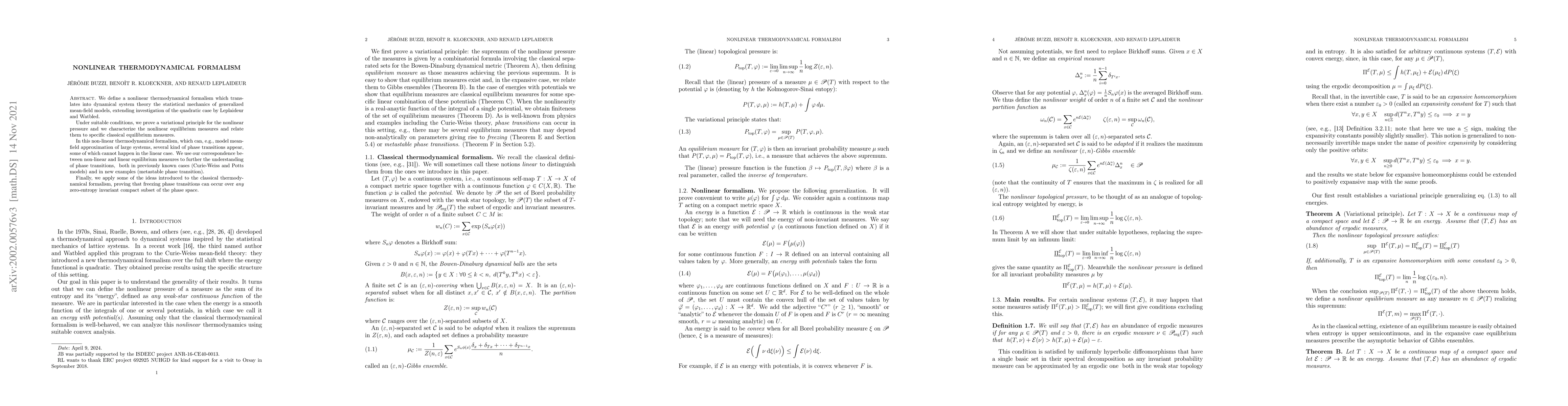 We define a nonlinear thermodynamical formalism which translates into dynamical system theory the statistical mechanics of generalized mean-field models, extending investigation of the quadratic case by Leplaideur and Watbled. Under suitable conditions, we prove a variational principle for the nonlinear pressure and we characterize the nonlinear equilibrium measures and relate them to specific classical equilibrium measures. In this non-linear thermodynamical formalism, which can, e.g., model mean-field approximation of large systems, several kind of phase transitions appear, some of which cannot happen in the linear case. We use our correspondence between non-linear and linear equilibrium measures to further the understanding of phase transitions, { both in previously known cases (Curie-Weiss and Potts models) and in} new examples (metastable phase transition). Finally, we apply some of the ideas introduced to the classical thermodynamical formalism, proving that freezing phase transitions can occur over \emph{any} zero-entropy invariant compact subset of the phase space.