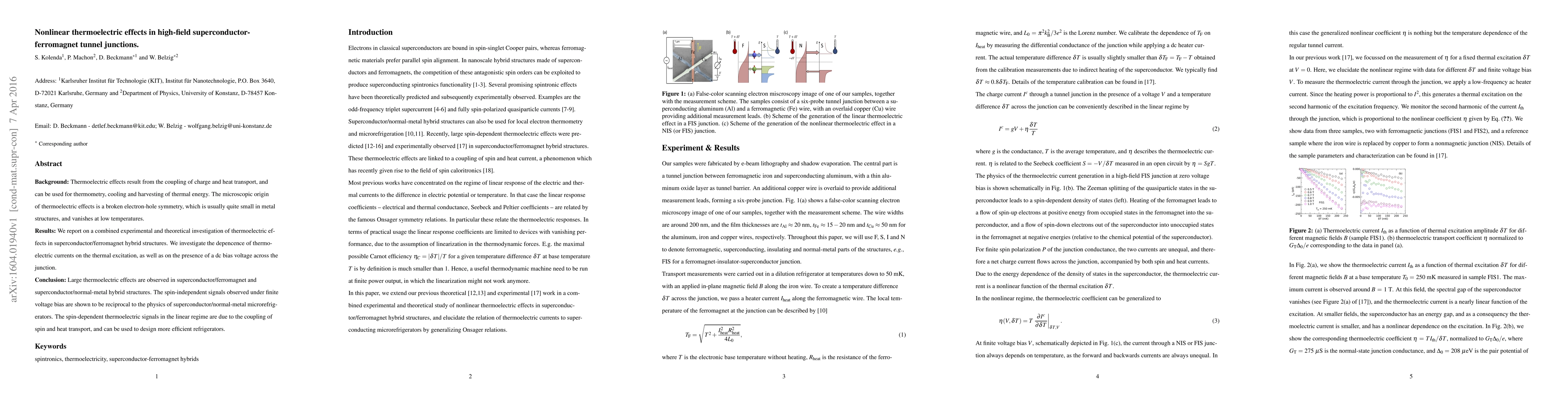 This paper explores nonlinear thermoelectric effects in superconductor-ferromagnet tunnel junctions, revealing significant thermoelectric currents dependent on thermal excitation and dc bias. The findings suggest potential for designing efficient thermoelectric refrigerators based on the coupling of spin and heat transport.