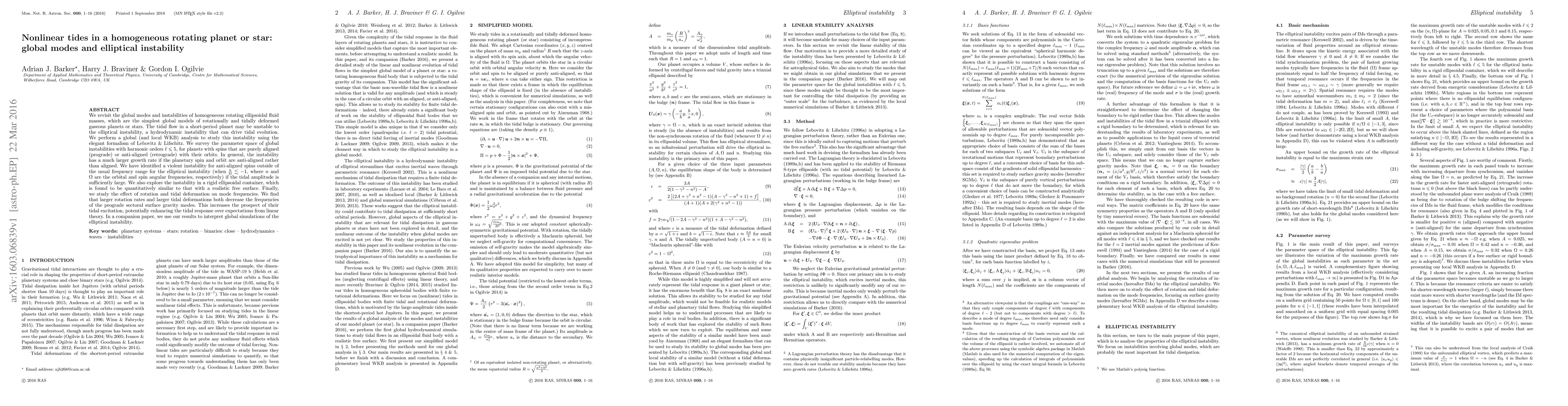 This paper investigates global modes and instabilities in homogeneous rotating ellipsoidal fluid masses, focusing on the elliptical instability that can drive tidal evolution in short-period planets. It finds that anti-aligned planetary spins and orbits lead to a more violent instability, especially outside the usual frequency range, and that larger rotation and tidal deformations decrease the frequencies of prograde sectoral surface gravity modes, potentially enhancing tidal excitation.