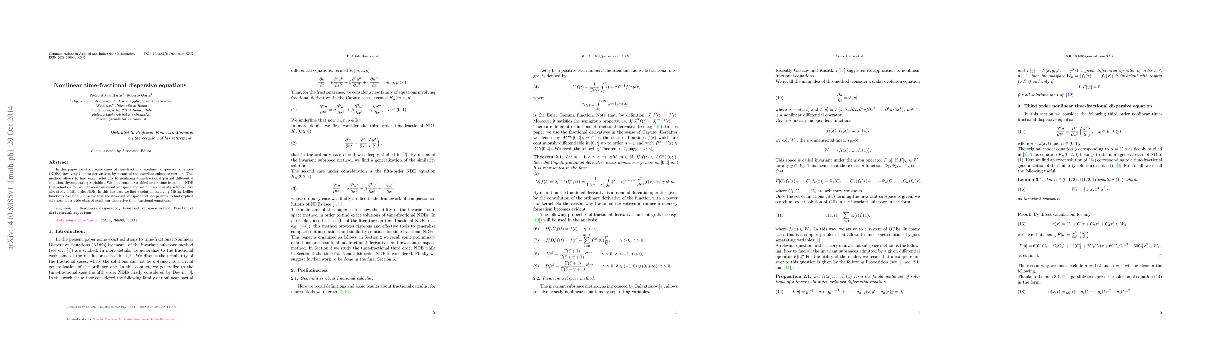 This paper investigates time-fractional nonlinear dispersive equations using the invariant subspace method, finding exact solutions for third and fifth orders involving Caputo derivatives, with the latter solution expressed in terms of Mittag-Leffler functions. The method proves effective for a broad range of such equations.