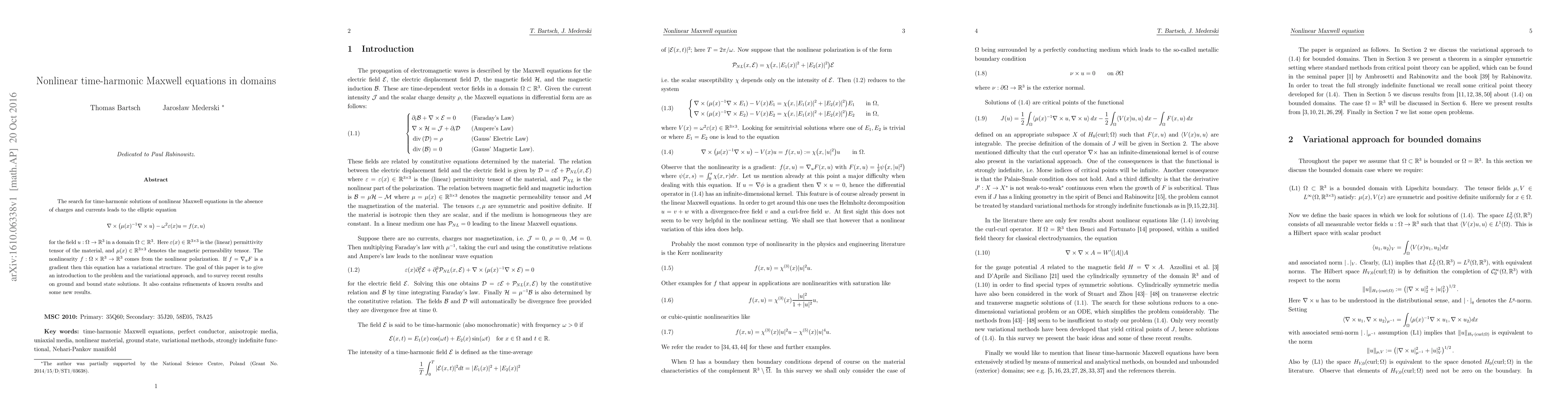 The search for time-harmonic solutions of nonlinear Maxwell equations in the absence of charges and currents leads to the elliptic equation $$\nabla\times\left(\mu(x)^{-1} \nabla\times u\right) - \omega^2\varepsilon(x)u = f(x,u)$$ for the field $u:\Omega\to\mathbb{R}^3$ in a domain $\Omega\subset\mathbb{R}^3$. Here $\varepsilon(x) \in \mathbb{R}^{3\times3}$ is the (linear) permittivity tensor of the material, and $\mu(x) \in \mathbb{R}^{3\times3}$ denotes the magnetic permeability tensor. The nonlinearity $f:\Omega\times\mathbb{R}^3\to\mathbb{R}^3$ comes from the nonlinear polarization. If $f=\nabla_uF$ is a gradient then this equation has a variational structure. The goal of this paper is to give an introduction to the problem and the variational approach, and to survey recent results on ground and bound state solutions. It also contains refinements of known results and some new results.
