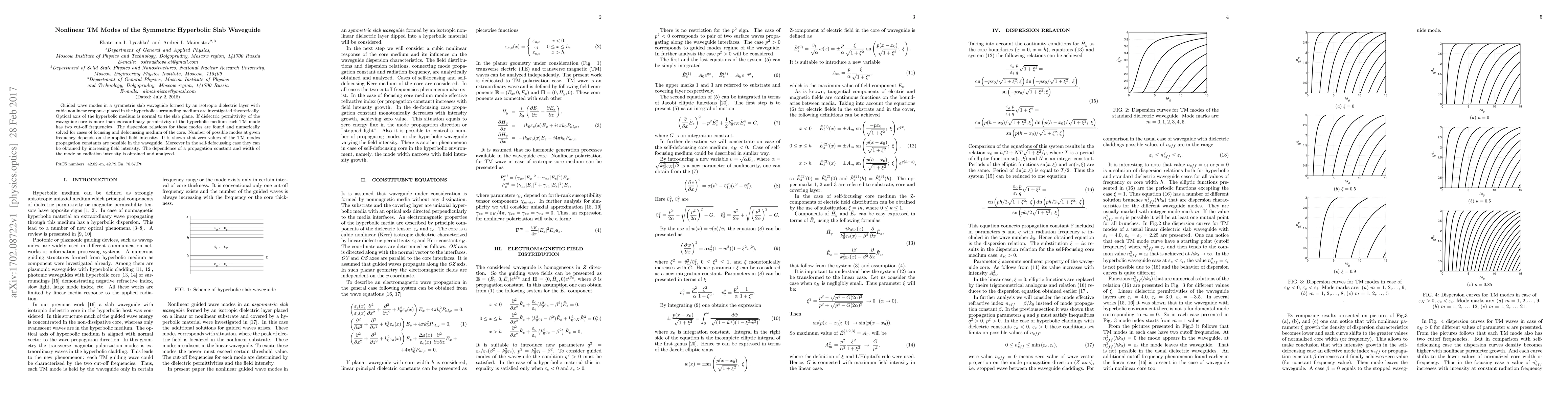 This paper investigates nonlinear transverse magnetic (TM) modes in a symmetric hyperbolic slab waveguide with a cubic nonlinear response. It finds that TM modes have two cut-off frequencies and their dispersion relations depend on the field intensity and the medium's focusing properties. The study also reveals that increasing field intensity can lead to zero propagation constants in self-defocussing cases.