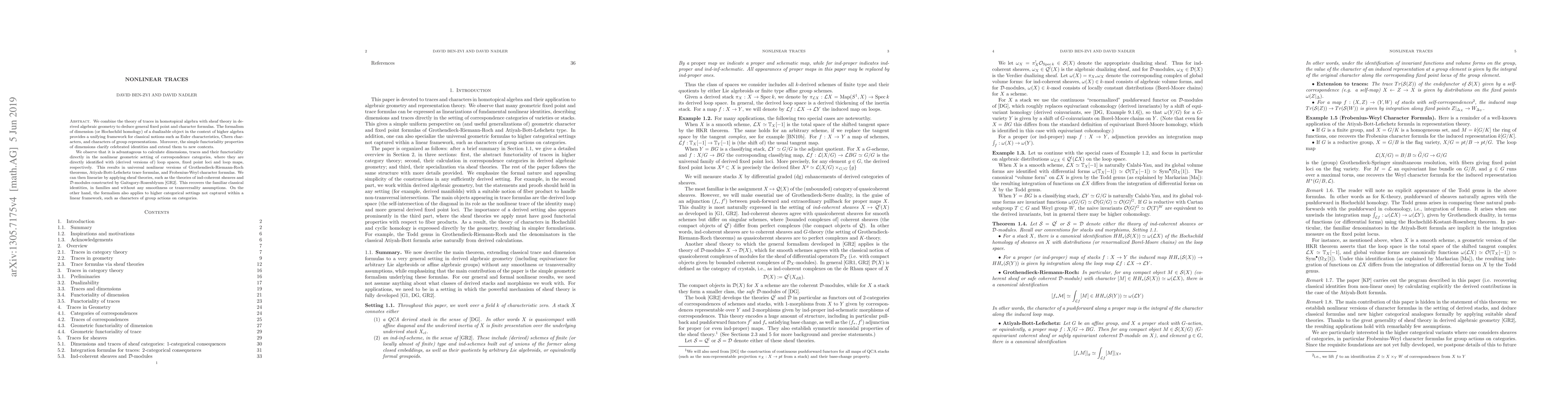 We combine the theory of traces in homotopical algebra with sheaf theory in derived algebraic geometry to deduce general fixed point and character formulas. The formalism of dimension (or Hochschild homology) of a dualizable object in the context of higher algebra provides a unifying framework for classical notions such as Euler characteristics, Chern characters, and characters of group representations. Moreover, the simple functoriality properties of dimensions clarify celebrated identities and extend them to new contexts. We observe that it is advantageous to calculate dimensions, traces and their functoriality directly in the nonlinear geometric setting of correspondence categories, where they are directly identified with (derived versions of) loop spaces, fixed point loci and loop maps, respectively. This results in universal nonlinear versions of Grothendieck-Riemann-Roch theorems, Atiyah-Bott-Lefschetz trace formulas, and Frobenius-Weyl character formulas. On the one hand, we can then linearize by applying sheaf theories, such as the theories of coherent sheaves and D-modules, developed by Gaitsgory and Rozenblyum, as functors out of correspondence categories (in the spirit of topological field theory). This recovers the familiar classical identities, in families and without any smoothness or transversality assumptions. On the other hand, the formalism also applies to higher categorical settings not captured within a linear framework, such as characters of group actions on categories.