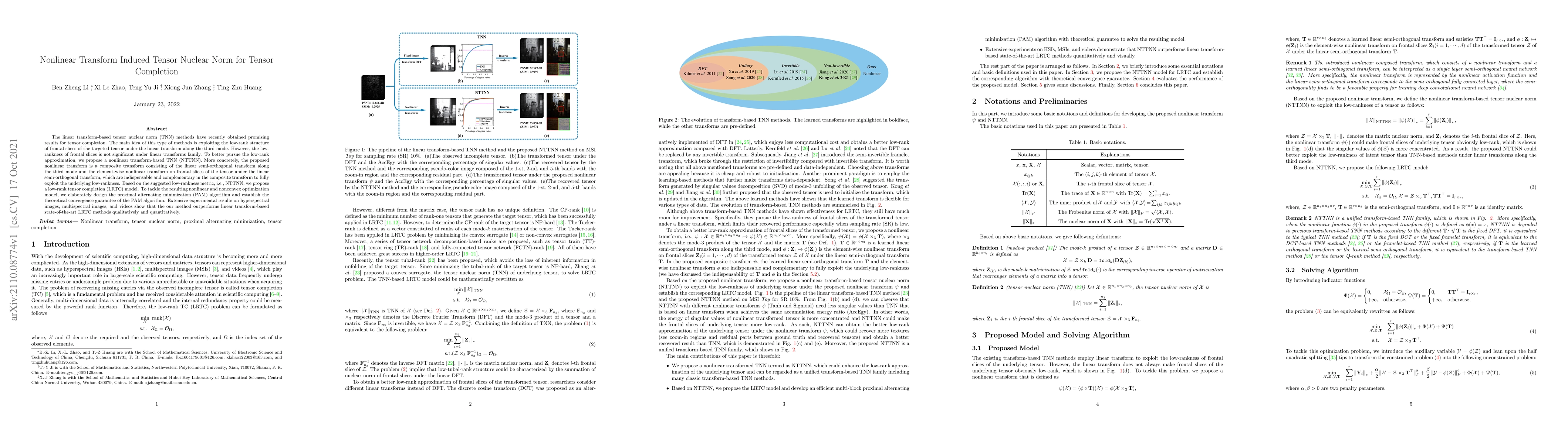 This paper proposes a nonlinear transform-based tensor nuclear norm (NTTNN) for tensor completion, which combines linear and element-wise nonlinear transformations to better exploit the tensor's low-rank structure. The method outperforms linear transform-based approaches in both qualitative and quantitative evaluations on various datasets.