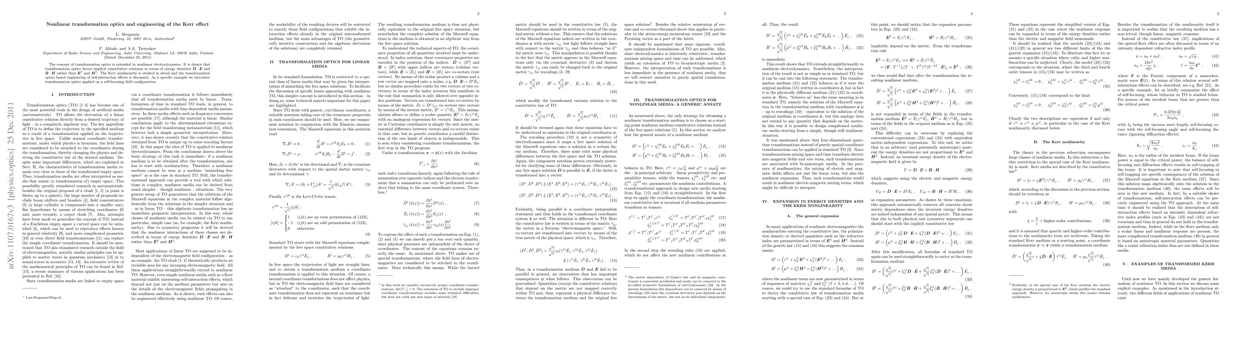This paper extends transformation optics to nonlinear electrodynamics, demonstrating its preference for implicit constitutive relations based on energy densities. It focuses on the Kerr effect and explores the engineering of self-interaction effects, exemplified by the application of transformation optics to self-focusing field configurations.