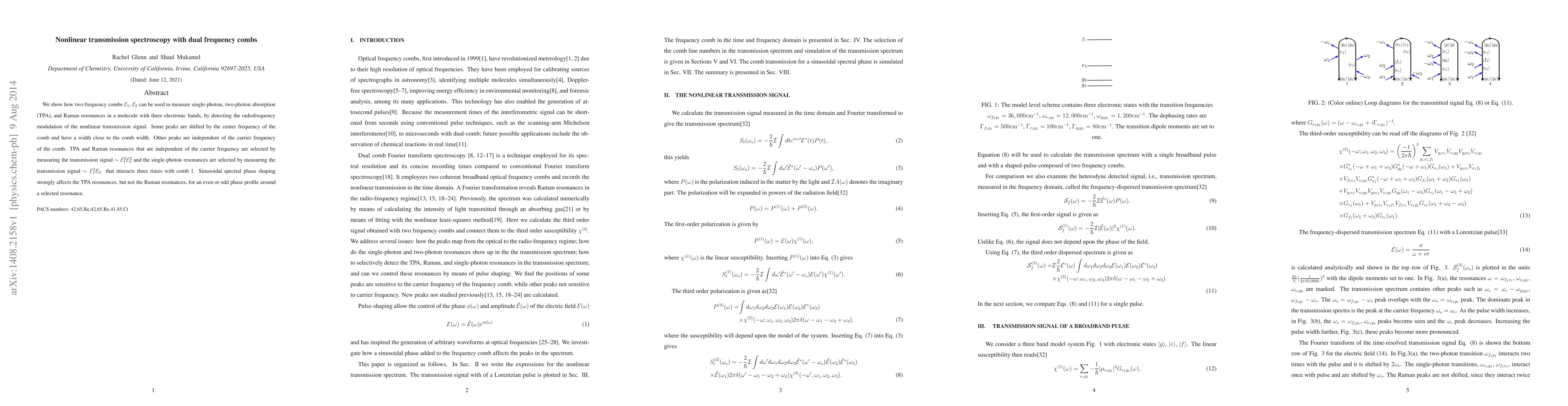 We show how two frequency combs $\mathcal{E}_1$, $\mathcal{E}_2$ can be used to measure single-photon, two-photon absorption (TPA), and Raman resonances in a molecule with three electronic bands, by detecting the radio frequency modulation of the nonlinear transmission signal. Some peaks are independent of the carrier frequency of the comb and others shift with that frequency and have a width close to the comb width. TPA and Raman resonances independent of the carrier frequency are selected by measuring the transmission signal $\sim\mathcal{E}_1^2 \mathcal{E}_2^2$ and the single-photon resonances are selected by measuring the transmission signal $\sim\mathcal{E}_1^3\mathcal{E}_2$. Sinusoidal spectral phase shaping strongly affects the TPA, but not the Raman resonances.