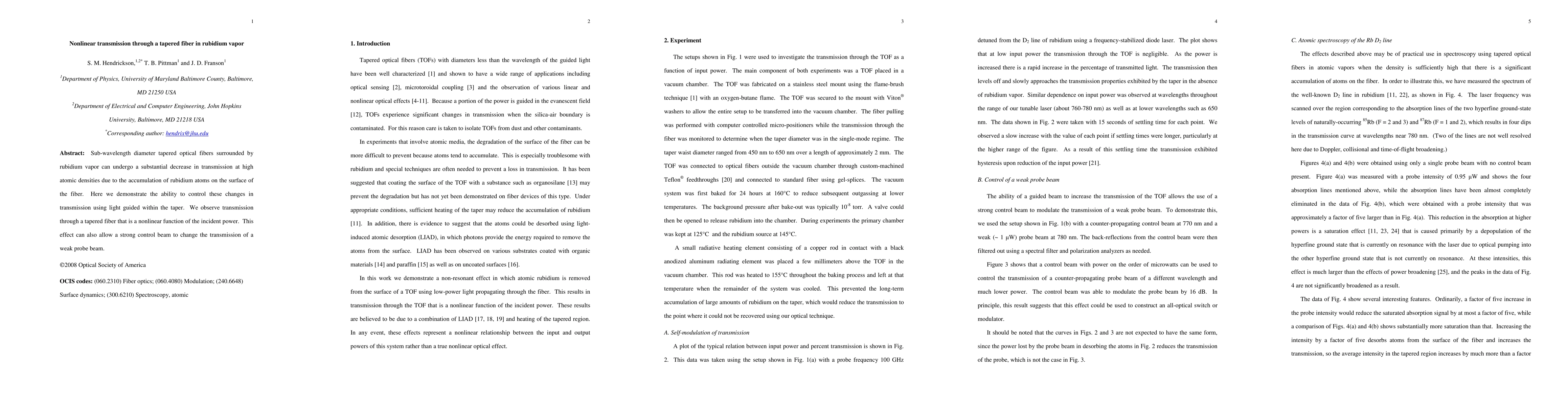 This research demonstrates nonlinear transmission through a tapered optical fiber in rubidium vapor, showing that high atomic densities can reduce transmission due to atom accumulation. The study reveals that the transmission is a nonlinear function of incident power, enabling control over probe beam transmission with a strong control beam.