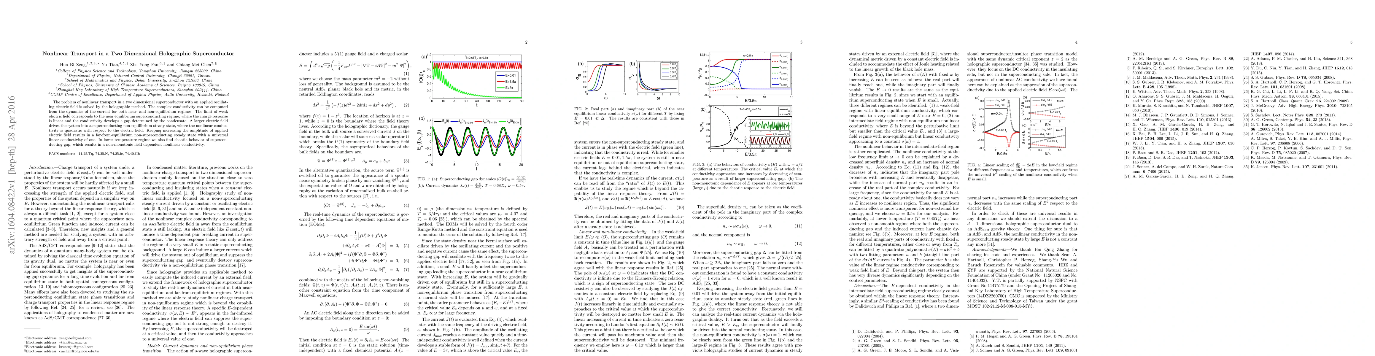 This paper uses the holographic method to study nonlinear transport in a two-dimensional superconductor under an oscillating electric field, revealing a gap in the near-equilibrium regime and a quadratic nonlinear conductivity in the non-equilibrium regime. The system transitions to a non-superconducting state with universal linear conductivity at high field amplitudes.