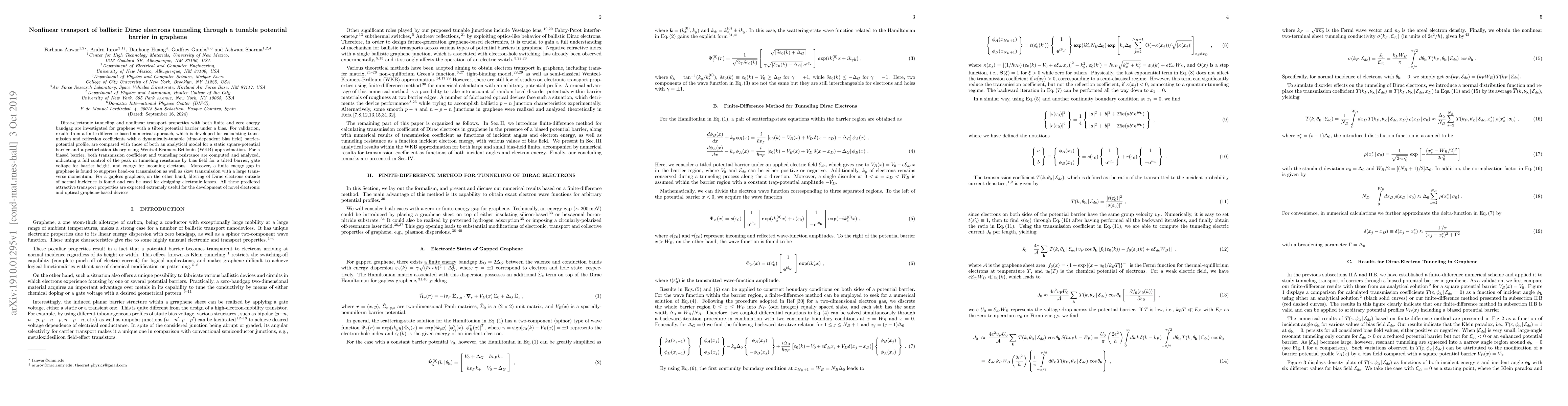 This paper investigates nonlinear transport of ballistic Dirac electrons in graphene through a tunable potential barrier, showing that a finite energy gap suppresses certain tunneling modes while gapless graphene allows for electron filtering. The study uses a numerical approach to validate analytical and perturbation theory models, revealing potential applications in advanced graphene-based electronic devices.