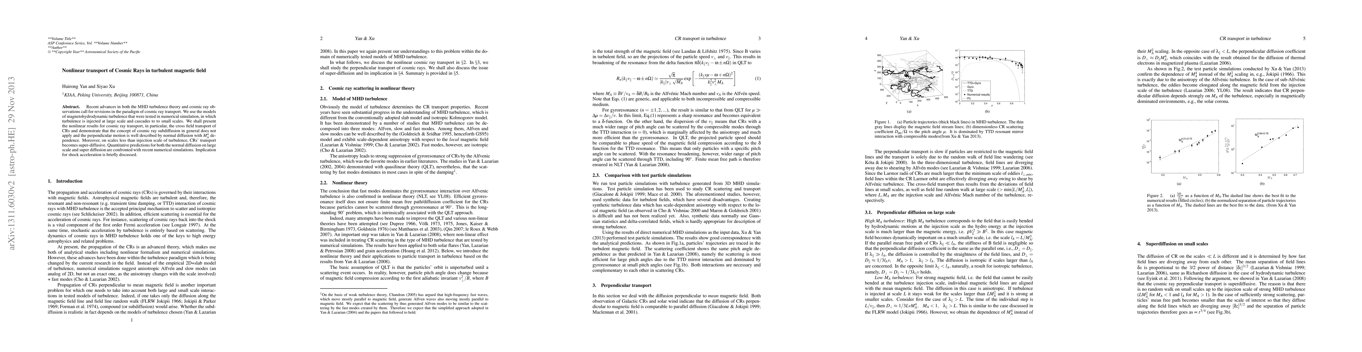 Recent advances in both the MHD turbulence theory and cosmic ray observations call for revisions in the paradigm of cosmic ray transport. We use the models of magnetohydrodynamic turbulence that were tested in numerical simulation, in which turbulence is injected at large scale and cascades to to small scales. We shall present the nonlinear results for cosmic ray transport, in particular, the cross field transport of CRs and demonstrate that the concept of cosmic ray subdiffusion in general does not apply and the perpendicular motion is well described by normal diffusion with M_A^4 dependence. Moreover, on scales less than injection scale of turbulence, CRs' transport becomes super-diffusive. Quantitative predictions for both the normal diffusion on large scale and super diffusion are confronted with recent numerical simulations. Implication for shock acceleration is briefly discussed.