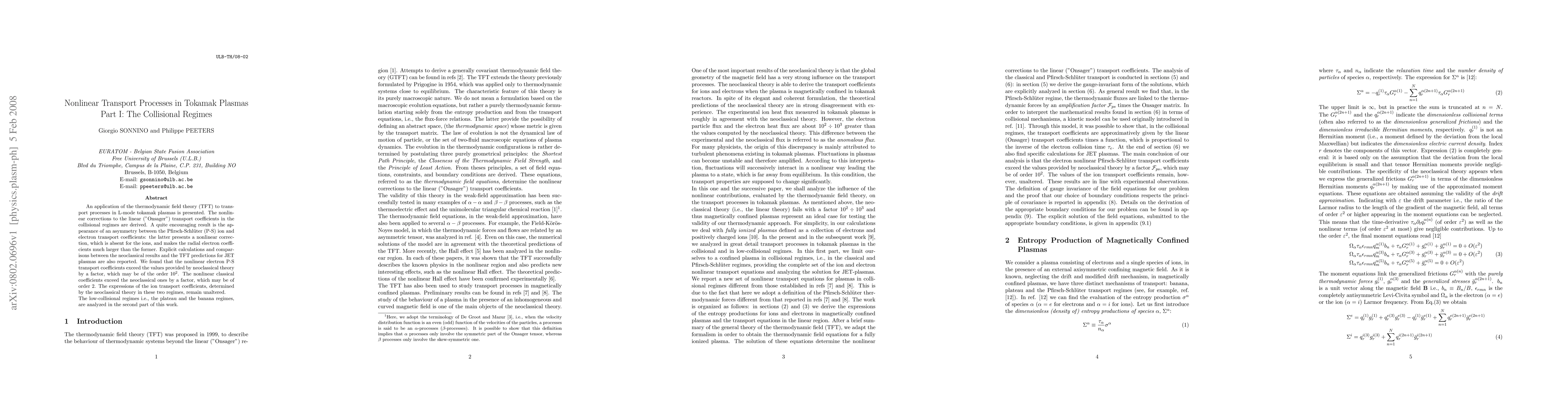 An application of the thermodynamic field theory (TFT) to transport processes in L-mode tokamak plasmas is presented. The nonlinear corrections to the linear (Onsager) transport coefficients in the collisional regimes are derived. A quite encouraging result is the appearance of an asymmetry between the Pfirsch-Schlueter (P-S) ion and electron transport coefficients: the latter presents a nonlinear correction, which is absent for the ions, and makes the radial electron coefficients much larger than the former. Explicit calculations and comparisons between the neoclassical results and the TFT predictions for JET plasmas are also reported. We found that the nonlinear electron P-S transport coefficients exceed the values provided by neoclassical theory by a factor, which may be of the order 100. The nonlinear classical coefficients exceed the neoclassical ones by a factor, which may be of order 2. The expressions of the ion transport coefficients, determined by the neoclassical theory in these two regimes, remain unaltered. The low-collisional regimes i.e., the plateau and the banana regimes, are analyzed in the second part of this work.