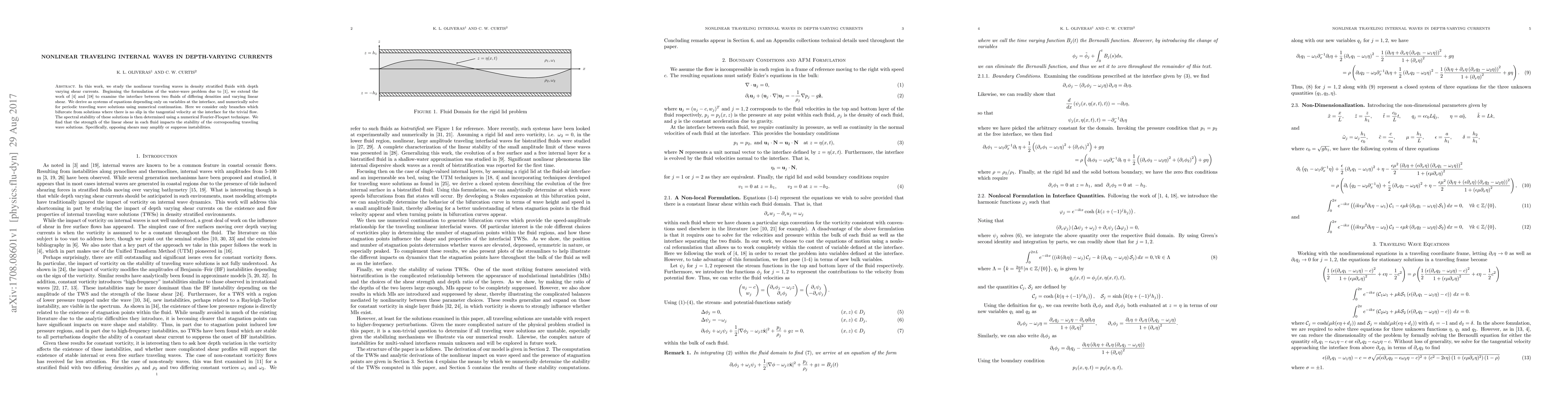 In this work, we study the nonlinear traveling waves in density stratified fluids with depth varying shear currents. Beginning the formulation of the water-wave problem due to [1], we extend the work of [4] and [18] to examine the interface between two fluids of differing densities and varying linear shear. We derive as systems of equations depending only on variables at the interface, and numerically solve for periodic traveling wave solutions using numerical continuation. Here we consider only branches which bifurcate from solutions where there is no slip in the tangential velocity at the interface for the trivial flow. The spectral stability of these solutions is then determined using a numerical Fourier-Floquet technique. We find that the strength of the linear shear in each fluid impacts the stability of the corresponding traveling wave solutions. Specifically, opposing shears may amplify or suppress instabilities.