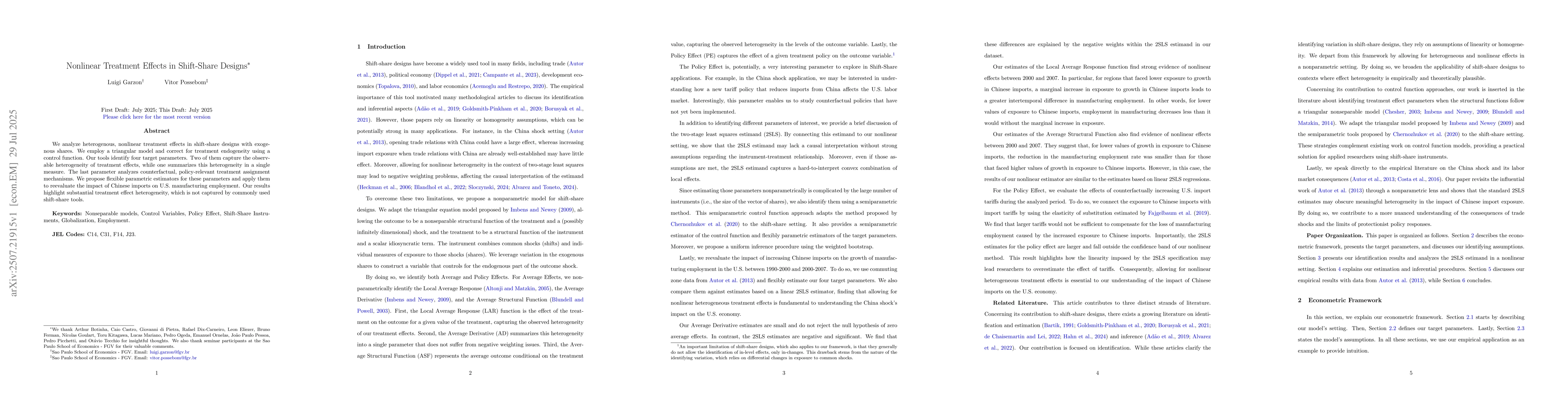 We analyze heterogenous, nonlinear treatment effects in shift-share designs with exogenous shares. We employ a triangular model and correct for treatment endogeneity using a control function. Our tools identify four target parameters. Two of them capture the observable heterogeneity of treatment effects, while one summarizes this heterogeneity in a single measure. The last parameter analyzes counterfactual, policy-relevant treatment assignment mechanisms. We propose flexible parametric estimators for these parameters and apply them to reevaluate the impact of Chinese imports on U.S. manufacturing employment. Our results highlight substantial treatment effect heterogeneity, which is not captured by commonly used shift-share tools.