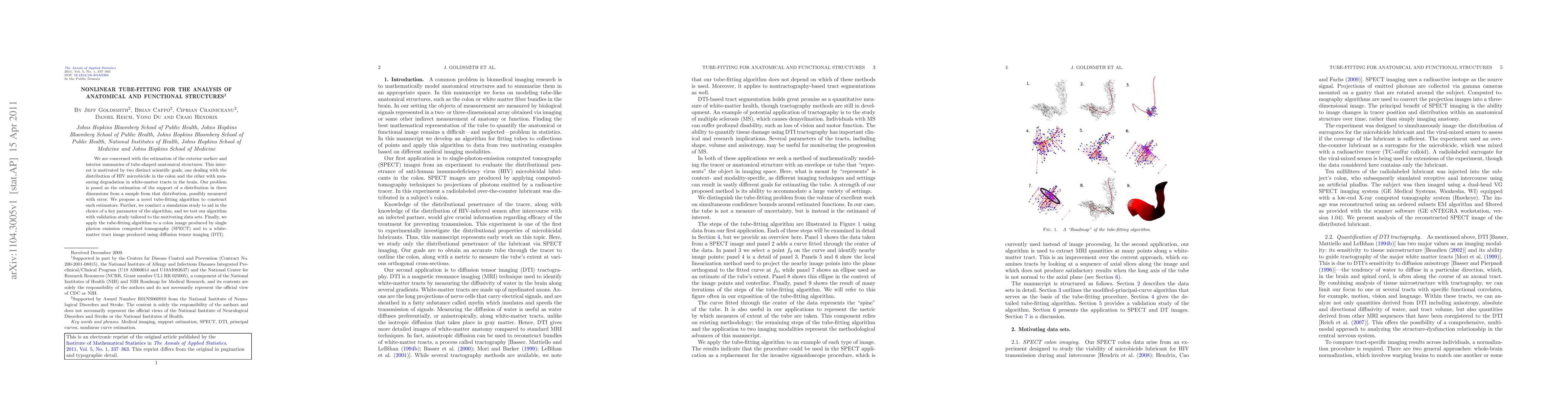 We are concerned with the estimation of the exterior surface and interior summaries of tube-shaped anatomical structures. This interest is motivated by two distinct scientific goals, one dealing with the distribution of HIV microbicide in the colon and the other with measuring degradation in white-matter tracts in the brain. Our problem is posed as the estimation of the support of a distribution in three dimensions from a sample from that distribution, possibly measured with error. We propose a novel tube-fitting algorithm to construct such estimators. Further, we conduct a simulation study to aid in the choice of a key parameter of the algorithm, and we test our algorithm with validation study tailored to the motivating data sets. Finally, we apply the tube-fitting algorithm to a colon image produced by single photon emission computed tomography (SPECT) and to a white-matter tract image produced using diffusion tensor imaging (DTI).