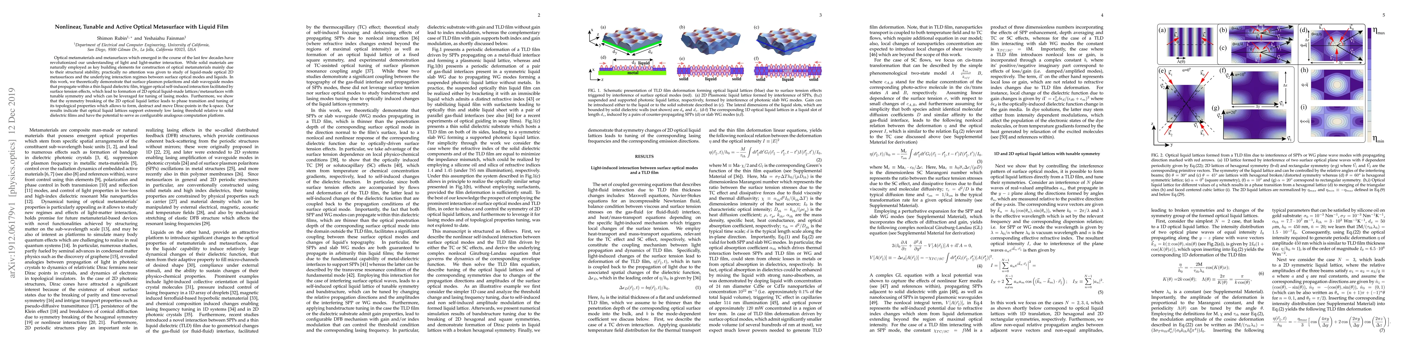 This paper explores the creation of tunable, nonlinear optical metasurfaces using liquid films, demonstrating that liquid-based 2D optical lattices can be manipulated through surface tension effects to achieve tunable symmetry and lasing modes. The study reveals that these liquid lattices exhibit low lasing thresholds and tunable topological properties, suggesting their potential for adaptable optical computation.