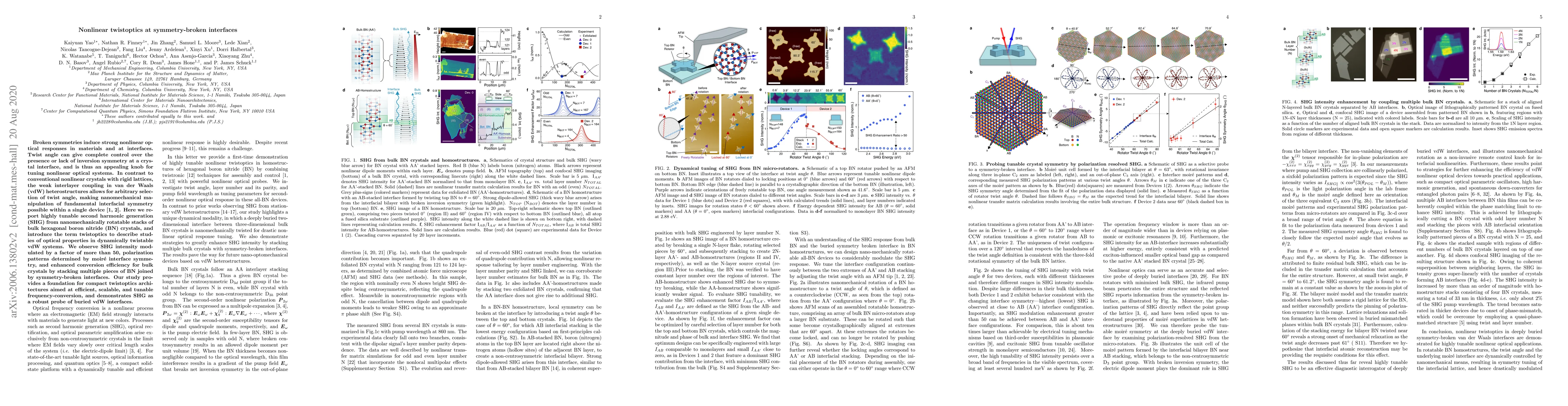 Broken symmetries induce strong nonlinear optical responses in materials and at interfaces. Twist angle can give complete control over the presence or lack of inversion symmetry at a crystal interface, and is thus an appealing knob for tuning nonlinear optical systems. In contrast to conventional nonlinear crystals with rigid lattices, the weak interlayer coupling in van der Waals (vdW) heterostructures allows for arbitrary selection of twist angle, making nanomechanical manipulation of fundamental interfacial symmetry possible within a single device. Here we report highly tunable second harmonic generation (SHG) from nanomechanically rotatable stacks of bulk hexagonal boron nitride (BN) crystals, and introduce the term twistoptics to describe studies of optical properties in dynamically twistable vdW systems. We observe SHG intensity modulated by a factor of more than 50, polarization patterns determined by moir\'e interface symmetry, and enhanced conversion efficiency for bulk crystals by stacking multiple pieces of BN joined by symmetry-broken interfaces. Our study provides a foundation for compact twistoptics architectures aimed at efficient, scalable, and tunable frequency-conversion, and demonstrates SHG as a robust probe of buried vdW interfaces.