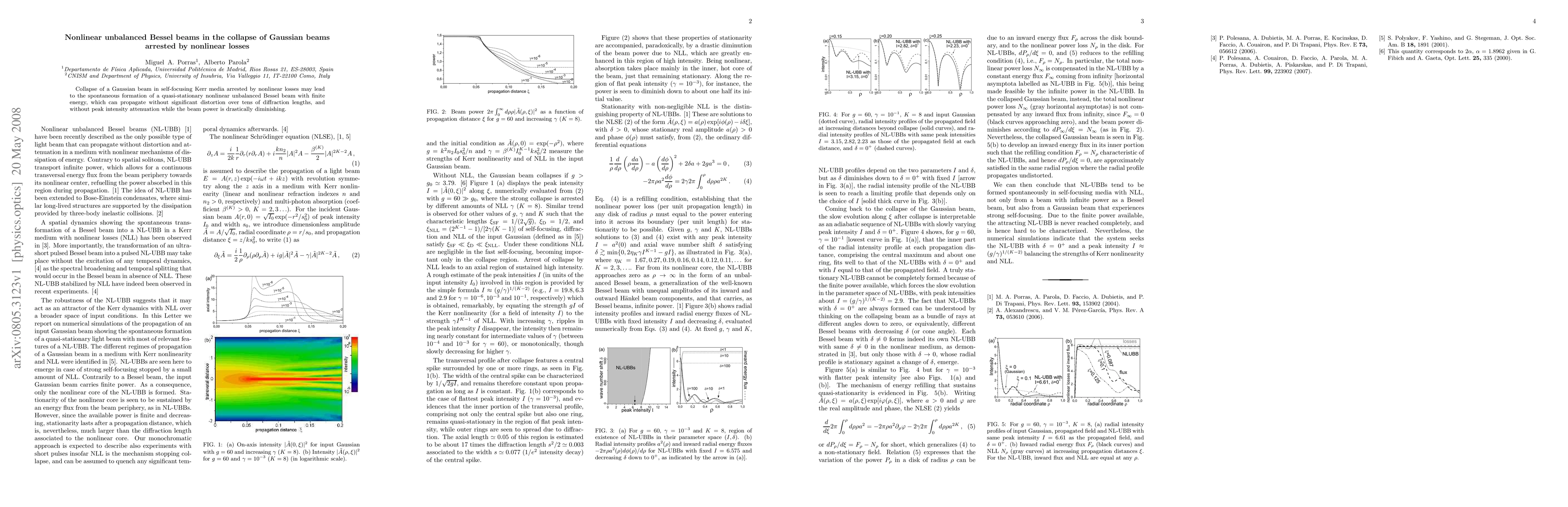 Summary: The collapse of Gaussian beams in Kerr media, halted by nonlinear losses, results in the emergence of quasi-stationary nonlinear unbalanced Bessel beams that maintain finite energy and propagate over long distances without significant distortion or intensity loss.