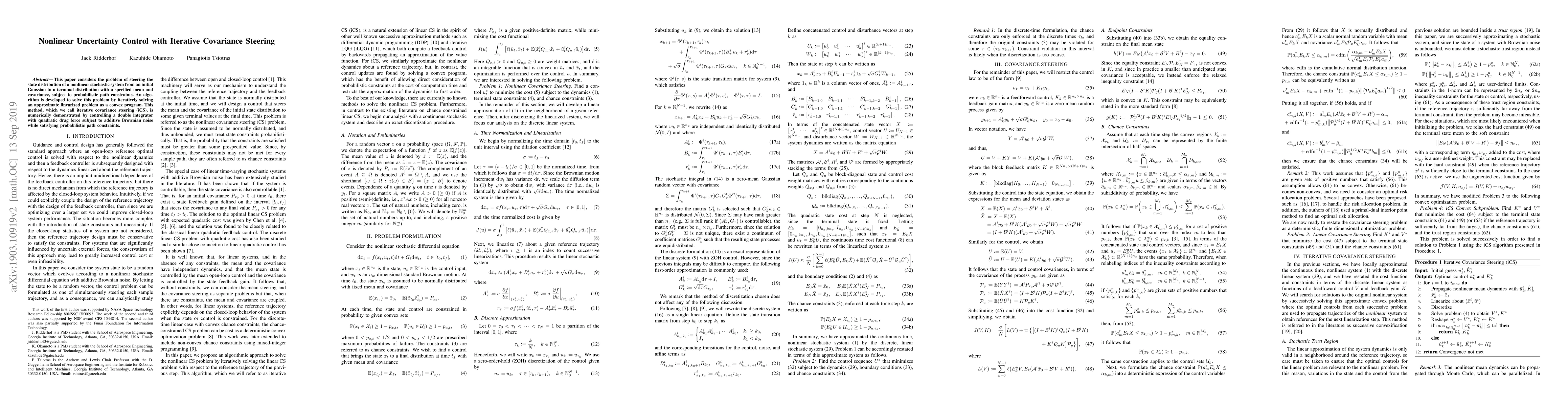 This paper proposes an iterative covariance steering (iCS) algorithm to steer the state distribution of a nonlinear stochastic system from an initial Gaussian to a desired terminal distribution, solving an approximate linearized convex problem iteratively. The method is demonstrated through controlling a double integrator under Brownian noise and probabilistic path constraints.