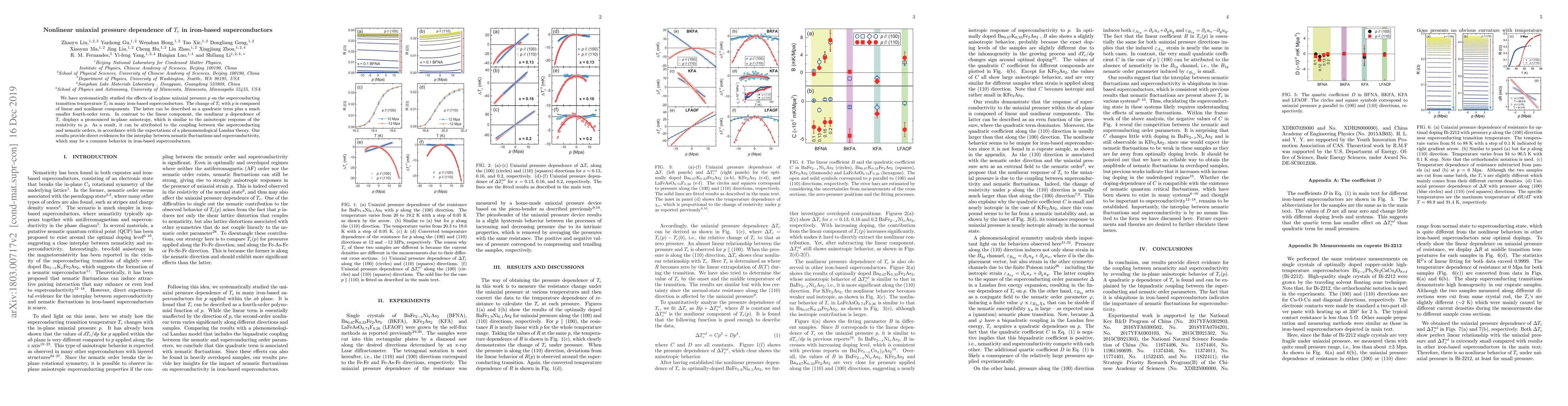 This study investigates the nonlinear uniaxial pressure dependence of the superconducting transition temperature ($T_c$) in iron-based superconductors, revealing a quadratic and a smaller fourth-order term in the pressure dependence. The nonlinear component shows in-plane anisotropy, suggesting a coupling between superconducting and nematic orders, providing evidence for the interplay between nematic fluctuations and superconductivity.