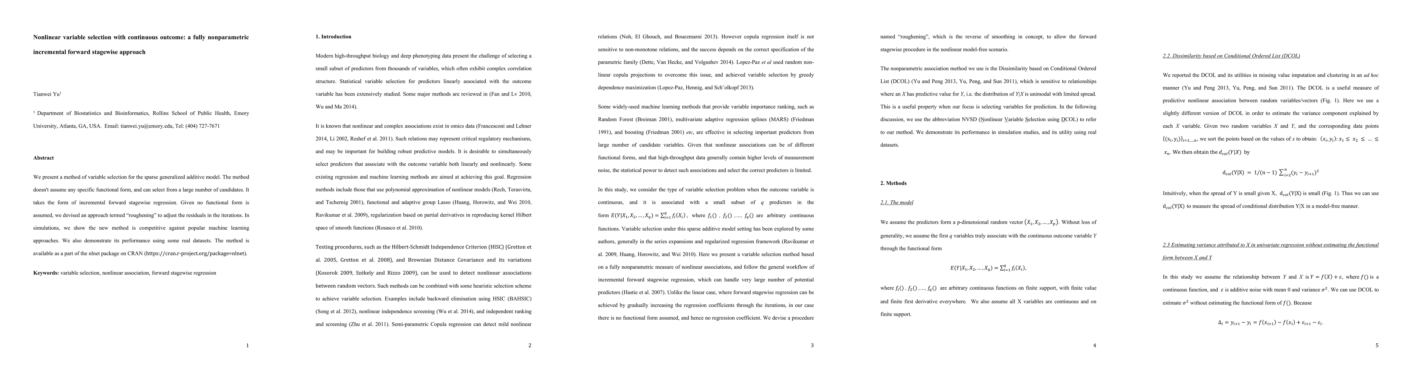 This paper presents a nonparametric incremental forward stagewise method for variable selection in sparse generalized additive models without assuming any specific functional form. The proposed "roughening" approach adjusts residuals iteratively, and simulations show its competitive performance against popular machine learning techniques, with implementation available in the nlnet package on CRAN.