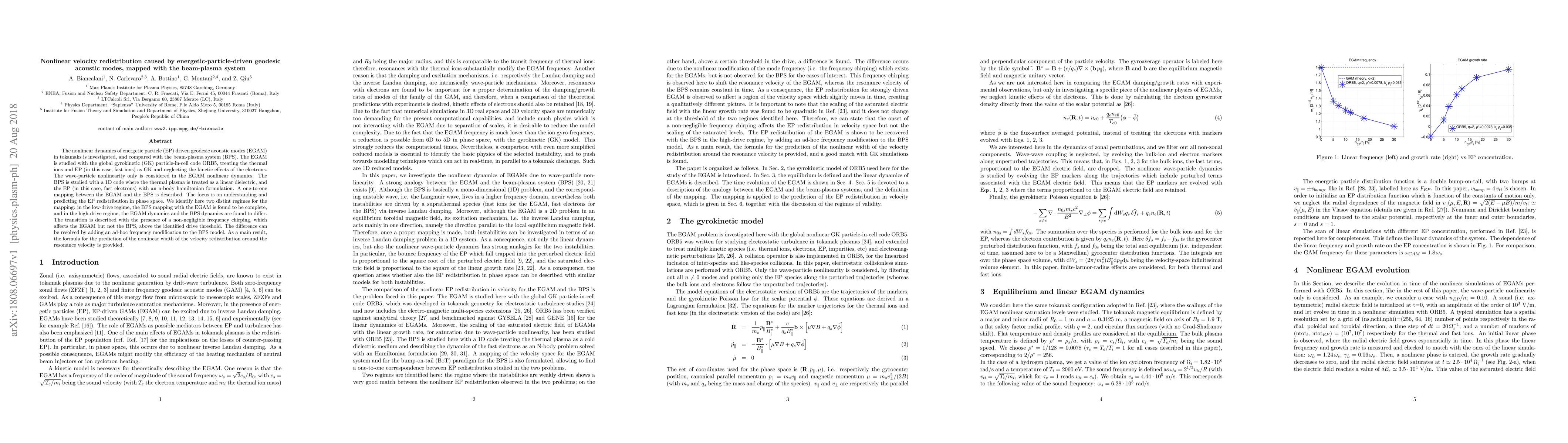 The nonlinear dynamics of energetic particle (EP) driven geodesic acoustic modes (EGAM) in tokamaks is investigated, and compared with the beam-plasma system (BPS). The EGAM is studied with the global gyrokinetic (GK) particle-in-cell code ORB5, treating the thermal ions and EP (in this case, fast ions) as GK and neglecting the kinetic effects of the electrons. The wave-particle nonlinearity only is considered in the EGAM nonlinear dynamics. The BPS is studied with a 1D code where the thermal plasma is treated as a linear dielectric, and the EP (in this case, fast electrons) with an n-body hamiltonian formulation. A one-to-one mapping between the EGAM and the BPS is described. The focus is on understanding and predicting the EP redistribution in phase space. We identify here two distint regimes for the mapping: in the low-drive regime, the BPS mapping with the EGAM is found to be complete, and in the high-drive regime, the EGAM dynamics and the BPS dynamics are found to differ. The transition is described with the presence of a non-negligible frequency chirping, which affects the EGAM but not the BPS, above the identified drive threshold. The difference can be resolved by adding an ad-hoc frequency modification to the BPS model. As a main result, the formula for the prediction of the nonlinear width of the velocity redistribution around the resonance velocity is provided.