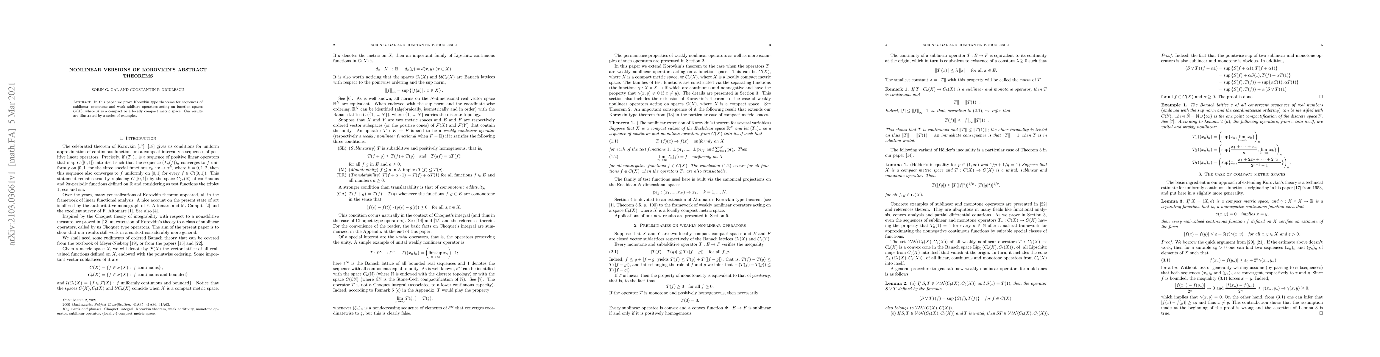 In this paper we prove Korovkin type theorems for sequences of sublinear, monotone and weak additive operators acting on function spaces C(X); where X is a compact or a locally compact metric space. Our results are illustrated by a series of examples