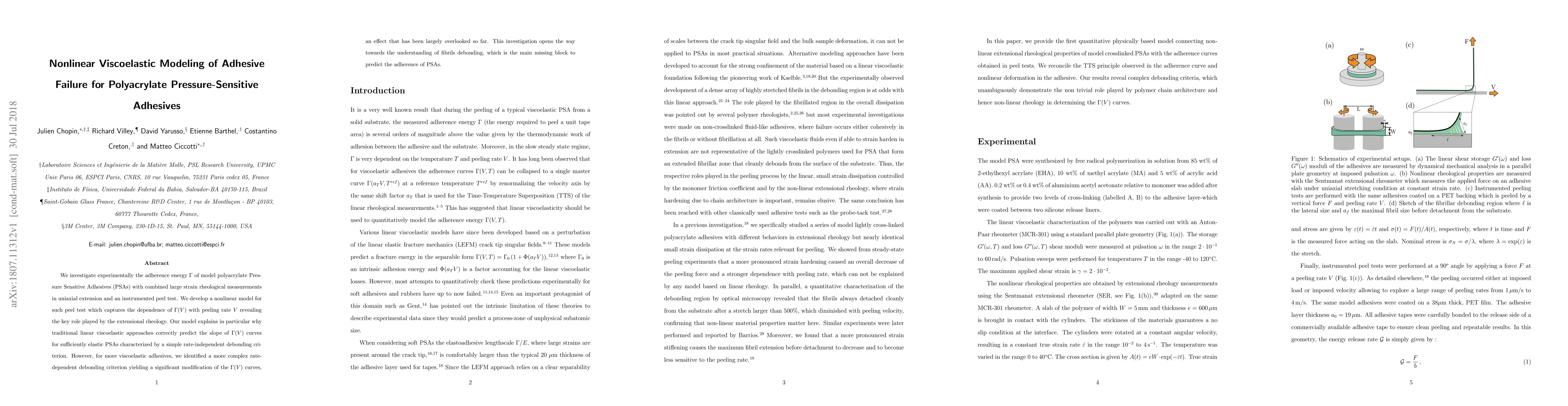 This study experimentally examines the adherence energy of polyacrylate pressure-sensitive adhesives using large strain rheological measurements and an instrumented peel test. It develops a nonlinear model that highlights the rate-dependent debonding behavior of viscoelastic adhesives, revealing a significant modification in adherence energy curves not captured by traditional linear models.