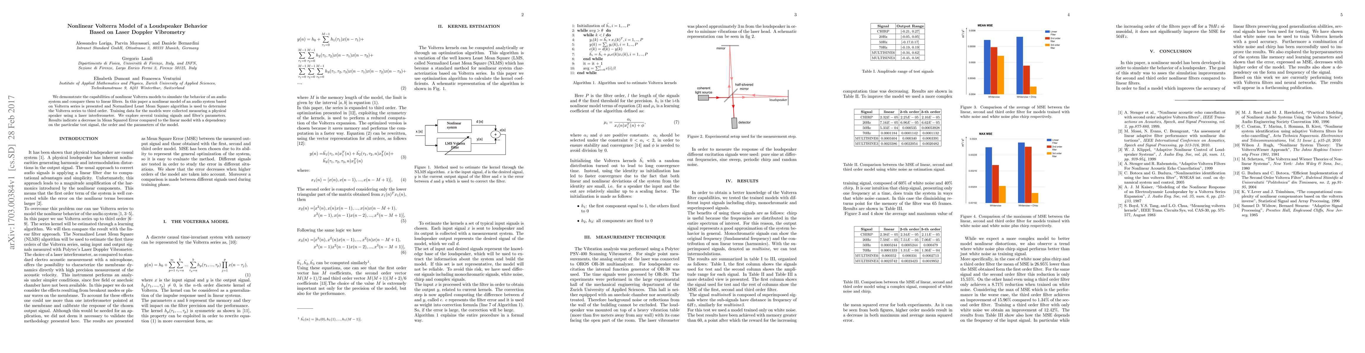 We demonstrate the capabilities of nonlinear Volterra models to simulate the behavior of an audio system and compare them to linear filters. In this paper a nonlinear model of an audio system based on Volterra series is presented and Normalized Least Mean Square algorithm is used to determine the Volterra series to third order. Training data for the models were collected measuring a physical speaker using a laser interferometer. We explore several training signals and filter's parameters. Results indicate a decrease in Mean Squared Error compared to the linear model with a dependency on the particular test signal, the order and the parameters of the model.