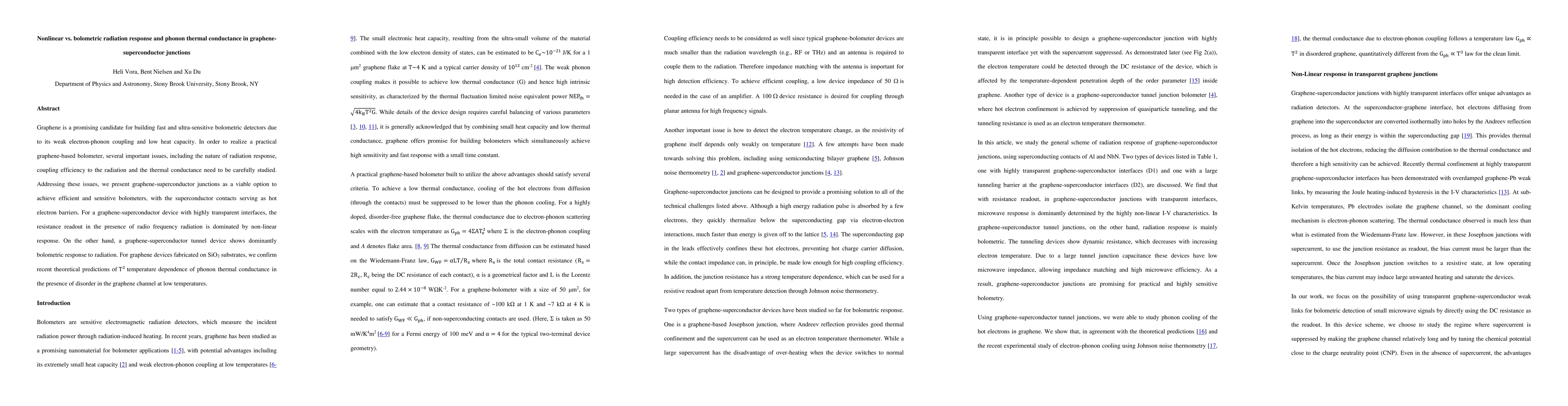 This paper investigates graphene-superconductor junctions for bolometric detectors, finding that non-linear radiation response dominates in highly transparent interfaces, while bolometric response is prominent in tunnel devices. It also confirms theoretical predictions of $T^{2}$ temperature dependence of phonon thermal conductance in disordered graphene on $SiO_{2}$ substrates.