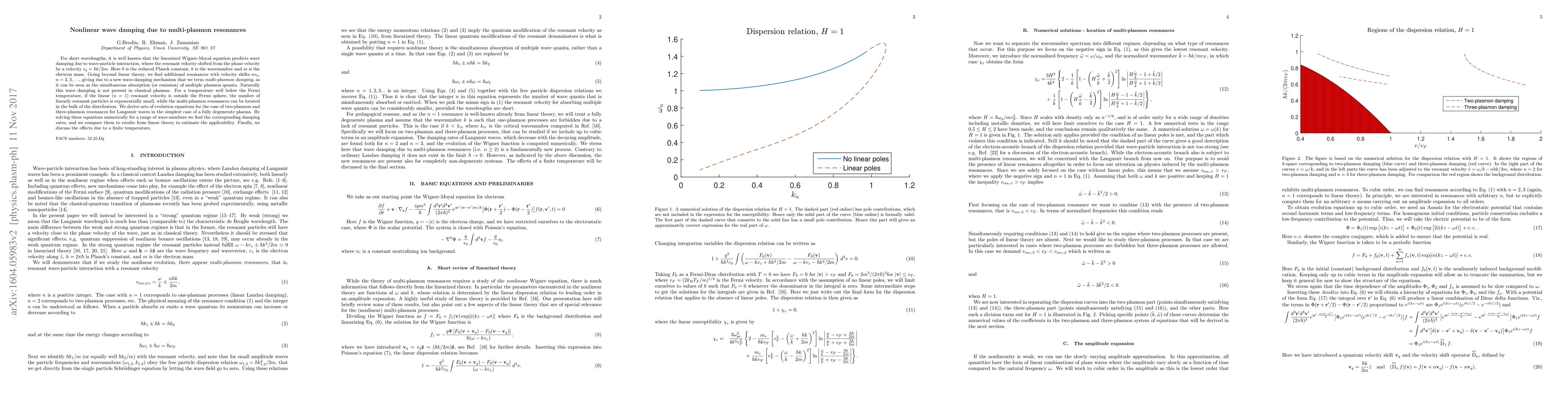 For short wavelengths, it is well known that the linearized Wigner-Moyal equation predicts wave damping due to wave-particle interaction, where the resonant velocity shifted from the phase velocity by a velocity $v_q = \hbar k/2m$. Here $\hbar$ is the reduced Planck constant, $k$ is the wavenumber and $m$ is the electron mass. Going beyond linear theory, we find additional resonances with velocity shifts $n v_q$, $n = 2, 3, \ldots$, giving rise to a new wave-damping mechanism that we term \emph{multi-plasmon damping}, as it can be seen as the simultaneous absorption (or emission) of multiple plasmon quanta. Naturally this wave damping is not present in classical plasmas. For a temperature well below the Fermi temperature, if the linear ($n = 1$) resonant velocity is outside the Fermi sphere, the number of linearly resonant particles is exponentially small, while the multi-plasmon resonances can be located in the bulk of the distribution. We derive sets of evolution equations for the case of two-plasmon and three-plasmon resonances for Langmuir waves in the simplest case of a fully degenerate plasma. By solving these equations numerically for a range of wave-numbers we find the corresponding damping rates, and we compare them to results from linear theory to estimate the applicability. Finally, we discuss the effects due to a finite temperature.