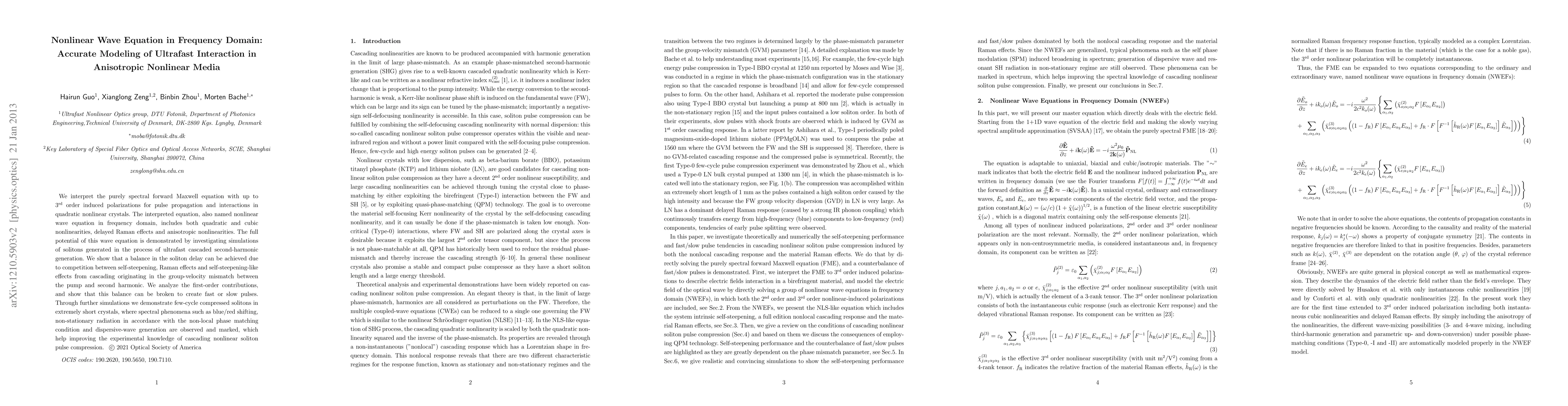 We interpret the purely spectral forward Maxwell equation with up to 3${^{\rm rd}}$ order induced polarizations for pulse propagation and interactions in quadratic nonlinear crystals. The interpreted equation, also named nonlinear wave equation in frequency domain, includes both quadratic and cubic nonlinearities, delayed Raman effects and anisotropic nonlinearities. The full potential of this wave equation is demonstrated by investigating simulations of solitons generated in the process of ultrafast cascaded second-harmonic generation. We show that a balance in the soliton delay can be achieved due to competition between self-steepening, Raman effects and self-steepening-like effects from cascading originating in the group-velocity mismatch between the pump and second harmonic. We analyze the first-order contributions, and show that this balance can be broken to create fast or slow pulses. Through further simulations we demonstrate few-cycle compressed solitons in extremely short crystals, where spectral phenomena such as blue/red shifting, non-stationary radiation in accordance with the non-local phase matching condition and dispersive-wave generation are observed and marked, which help improving the experimental knowledge of cascading nonlinear soliton pulse compression.