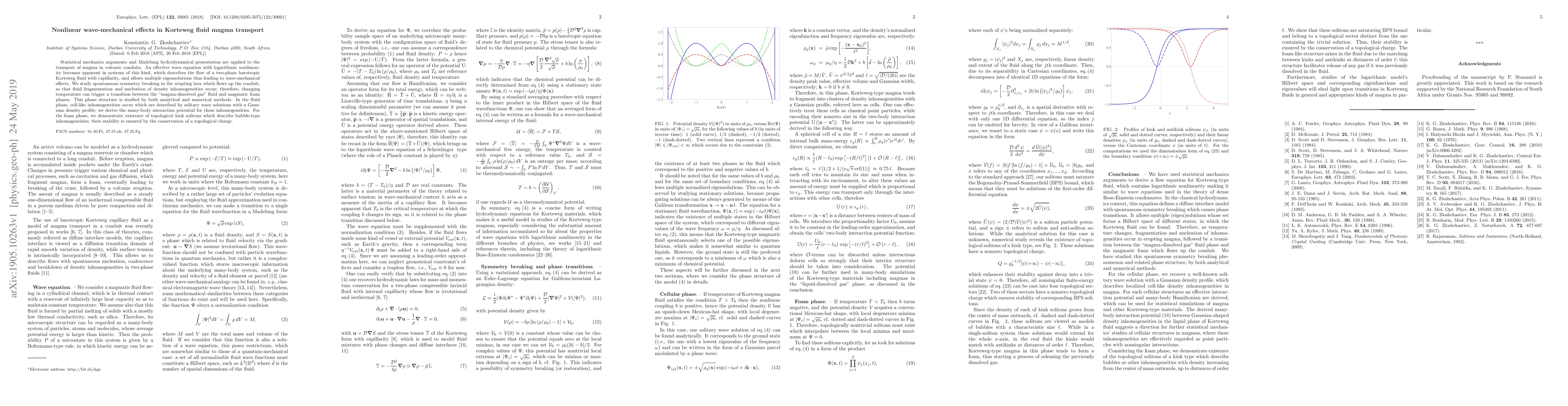 Statistical mechanics arguments and Madelung hydrodynamical presentation are applied to the transport of magma in volcanic conduits. An effective wave equation with logarithmic nonlinearity becomes apparent in systems of this kind, which describes the flow of a two-phase barotropic Korteweg fluid with capillarity, and allows multiple eigensolutions thus leading to wave-mechanical effects. We study spontaneous symmetry breaking in the erupting lava which flows up the conduit, so that fluid fragmentation and nucleation of density inhomogeneities occur; therefore, changing temperature can trigger a transition between the "magma-dissolved gas" fluid and magmatic foam phases. This phase structure is studied by both analytical and numerical methods. In the fluid phase, cell-like inhomogeneities occur which are described by solitary wave solutions with a Gaussian density profile; we derive the many-body interaction potential for these inhomogeneities. For the foam phase, we demonstrate existence of topological kink solitons which describe bubble-type inhomogeneities; their stability is ensured by the conservation of a topological charge.