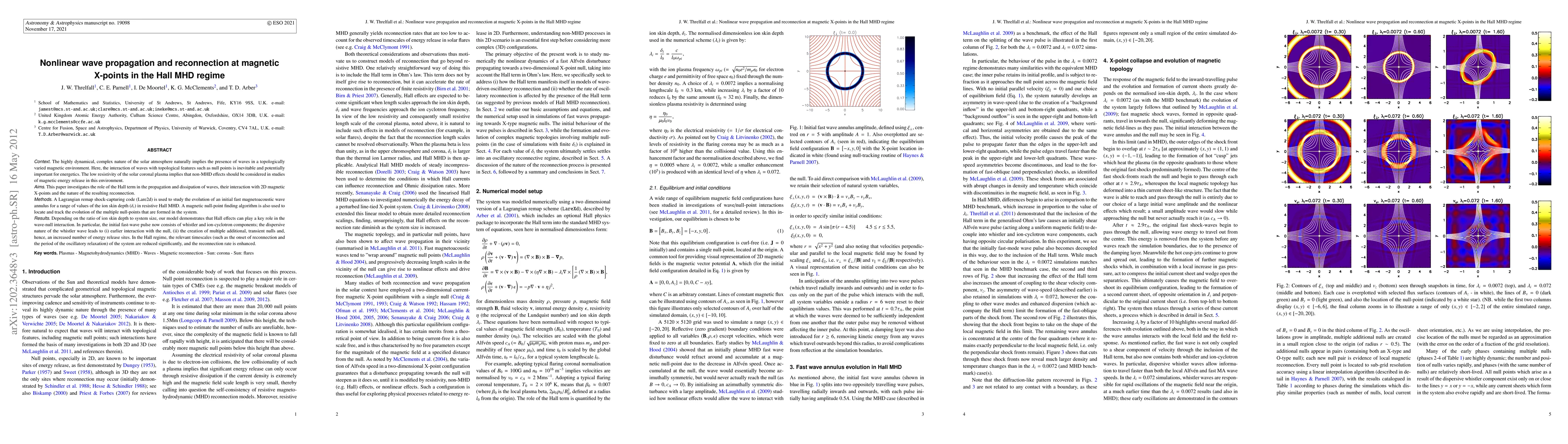 This paper investigates the nonlinear wave propagation and reconnection dynamics at magnetic X-points in the Hall magnetohydrodynamic (MHD) regime, demonstrating that Hall effects significantly enhance wave-null interactions, leading to increased reconnection rates and multiple transient energy release sites. The study uses a Lagrangian remap shock-capturing code to model these phenomena.