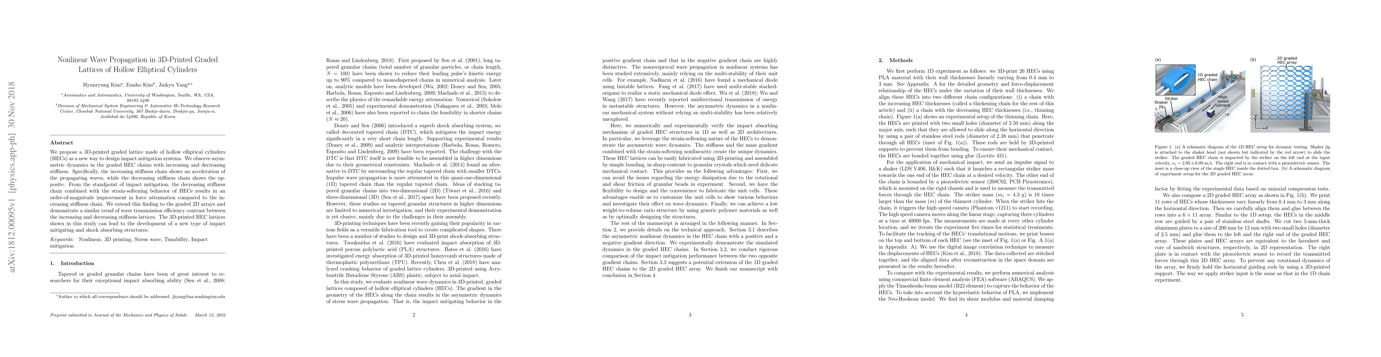 This paper proposes a 3D-printed graded lattice of hollow elliptical cylinders for impact mitigation, showing asymmetric wave propagation dynamics. The decreasing stiffness chain significantly enhances force attenuation, suggesting potential for new shock-absorbing structures.