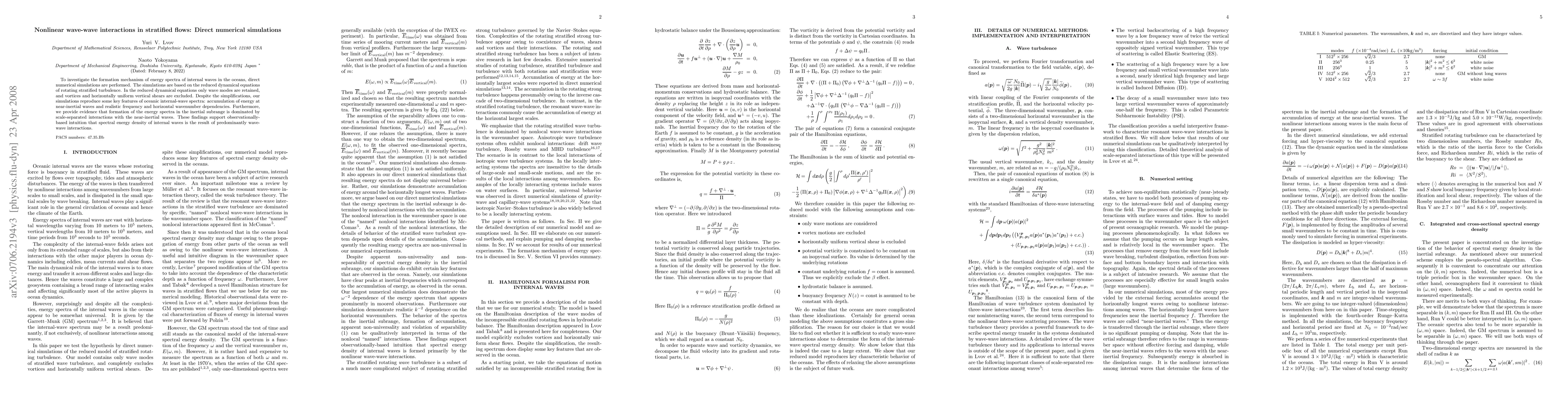 This paper uses direct numerical simulations based on reduced dynamical equations to explore the formation of internal wave energy spectra in stratified ocean flows. The simulations reveal key features of oceanic internal-wave spectra, emphasizing the dominant role of scale-separated wave-wave interactions in shaping the inertial subrange energy distribution.