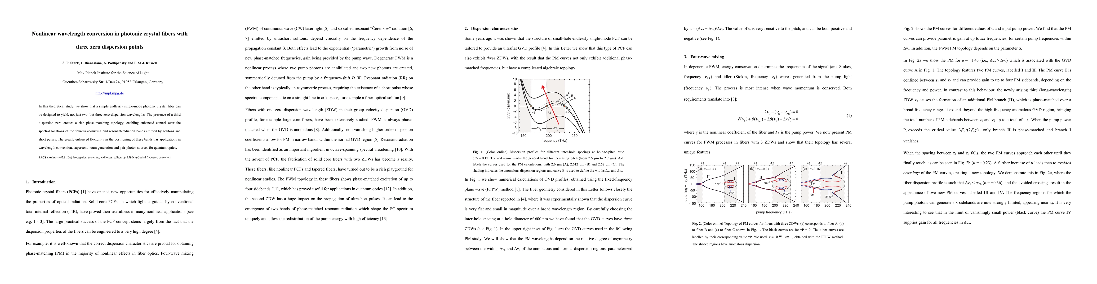 This paper demonstrates the design of a photonic crystal fiber with three zero-dispersion points, which enhances nonlinear wavelength conversion and enables precise control over the spectral locations of four-wave-mixing and resonant-radiation bands, with applications in supercontinuum generation and quantum optics.