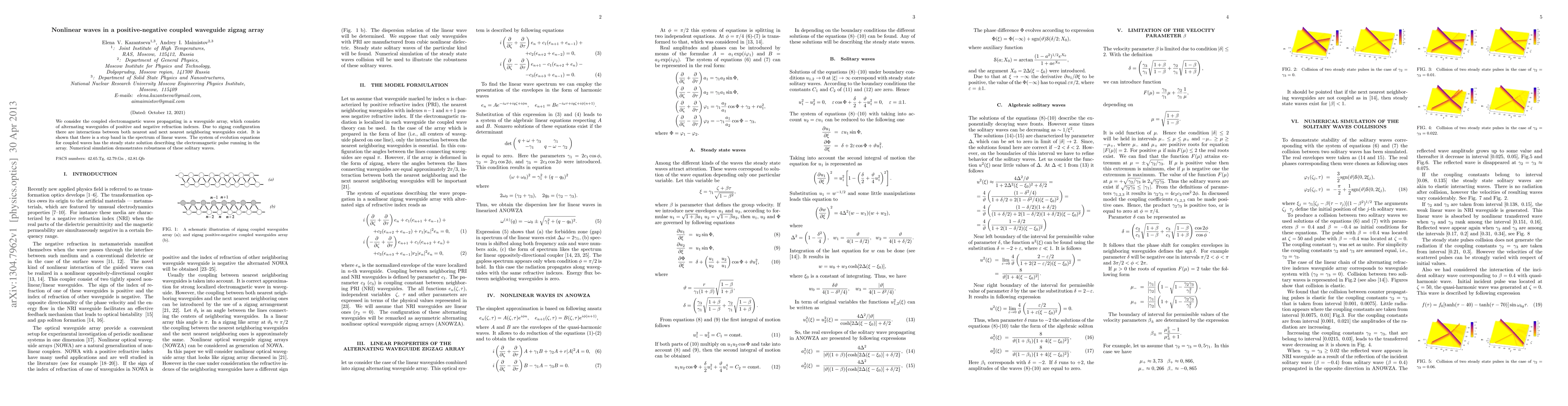 This paper investigates nonlinear waves in a zigzag waveguide array with alternating positive and negative refraction indices, revealing a stop band for linear waves and demonstrating the existence of robust solitary electromagnetic pulses through numerical simulations.
