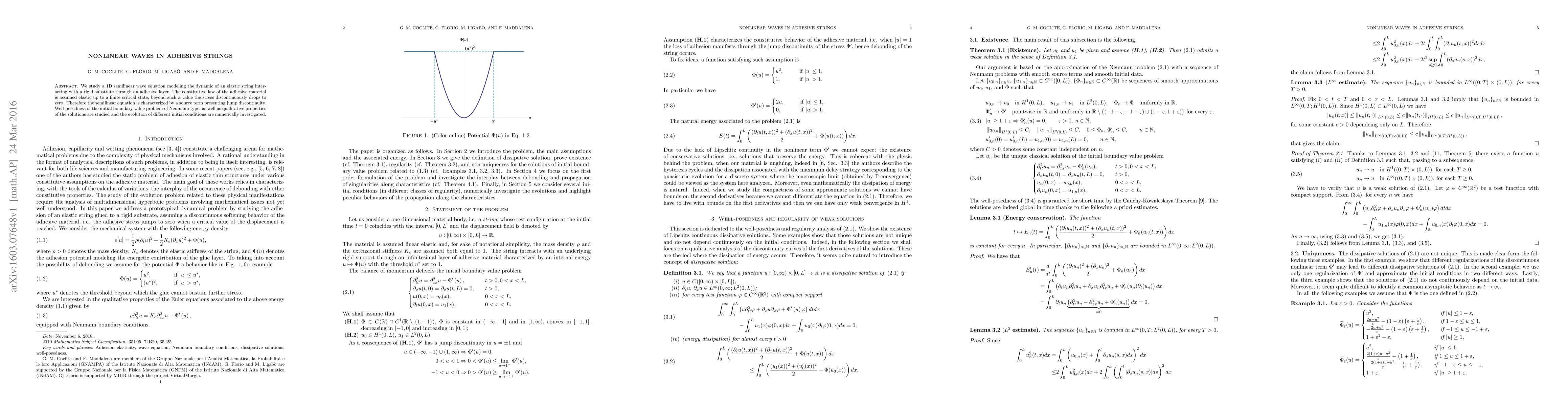 We study a 1D semilinear wave equation modeling the dynamic of an elastic string interacting with a rigid substrate through an adhesive layer. The constitutive law of the adhesive material is assumed elastic up to a finite critical state, beyond such a value the stress discontinuously drops to zero. Therefore the semilinear equation is characterized by a source term presenting jump discontinuity. Well-posedness of the initial boundary value problem of Neumann type, as well as qualitative properties of the solutions are studied and the evolution of different initial conditions are numerically investigated.